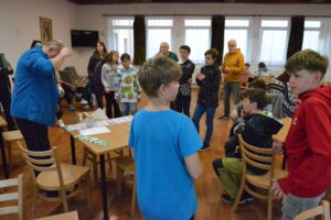 Marian černými Kana, Petr bílými hru dvou jezdců s d4 a e5, Saša černými giucco pianissimo, jak kdyby to hrála bílými ona, Matěj skotskou, kterou měl předtím černýma, teď brání Vilda, Tonda proti královskému gambitu, už mimo teorii.