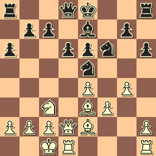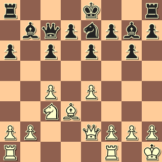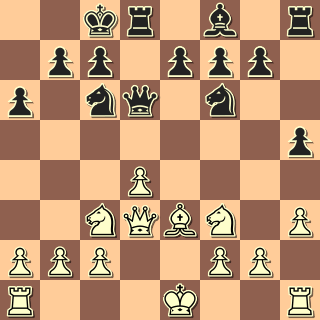 12. c6!(?) První hodně zajímavý moment (viz diagram) a důkaz předchozího tvrzení. Opticky to vypadá za bílého dobře, ale po  Ba3+ už hlásí ploutev malou výhodu černého. 13. Kd2 bxc6 14. Ke2 Ke7 15. Rd2 Rhd8 ještě nic nekazí, ale (15… Nc5 16. Rhd1 Rhd8 dávalo už hmatatelné plus) 16. Rhd1 Be8? A to už je zbytečně pasivní po (16… Nc5 17. Bxc5+ Bxc5 bílá aktivita končí a černý stojí lépe) 17. Rxd8 Nxd8 18. Rb1?! Pro změnu jediný slabší moment bílého, po přechodné oběti na e5 by se mi pozice rozpadla. Bf7 (18… Bd6) 19. Bxf7 Kxf7 20. Rb3 Bd6 (20… Be7) 21. Nd2! Nepříjemný tah, možná už vyhrávající, minimálně z hlediska psychiky. Rb8? (21… Bc7 22. Nc4 Ke6 23. Ra3 a5) 22. Nc4 Bc7 23. Bxa7 Aha… Ra8 24. Ra3 Ke6 25. Bc5 Rxa3 26. Bxa3 Nb7 a v koncovce, kterou hrál !devítiletý! klučina jak z učebnice, jsem postupně a potupně vykrvácel… 1-0 PS: Po zastavení hodin měl černý 10 sekund, bílý… 19 minut 😀