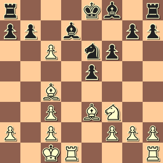 Poněkud nestandardní pozice vznikla, světe div se, ze sicilského Paulsena. Bílý jde (po předchozí profilaxi Kh1) osvědčenou cestou. 12. f4 O-O?! A černý leze přímo pod útok. 13. f5 exf5 14. exf5 Qe5 15. Qxe5 Bxe5 Ani po výměně dam se soupeři neuleví.16. Bh6 Rfe8 17. Rae1 f6 18. fxg6 Bohužel původně plánovaná oběť kvality na e5 nevychází, ale nevadí, jde to i bez násilí. Nxg6 19. c5! Fixace slabého pole d6 a především mrtvoly na b7. Počítač radí tah jezdcem na e4 též s velkou výhodou. Bxc3 20. bxc3 Rxe1 21. Rxe1 Ne5 22. Bf5 Kh8 23. Bf4 Ng6 24. Bd6 Rg8 25. Bxd7 Nh4 26. Re8 Jednoduchá výmluva a protiútok se nekoná. Rxe8 27.Bxe8 a černý ve střelcovce jen přihlížel 1-0