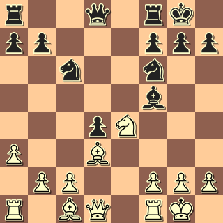 10. Qd3?! Nevhodné pole pro babu, lépe Dd2 viz Trhal-Pokorný kdysi dávno v krajském přeboru a skončilo to remízou. e5 11. O-O-O Be6 12. Kb1 Be7 13. f3? Bílý nenašel odvahu oželet g2 a už v mírně horší pozici jde na špalek. Rd8 14. Qe2 O-O 15. Rd3? V pozici, kdy bílý bělopolák představuje těžko řešitelný problém, přichází kiks. Bc4 16. Rxd8 Bxe2 17. Rxf8+ Kxf8 18. Bxe2 Dáma na věž a figuru spolehlivě stačí. Bc5 19. Bxc5+ Qxc5 20. Rf1 f5 s dalším vytvořením volného e pěšce a výhrou 0-1