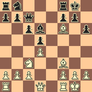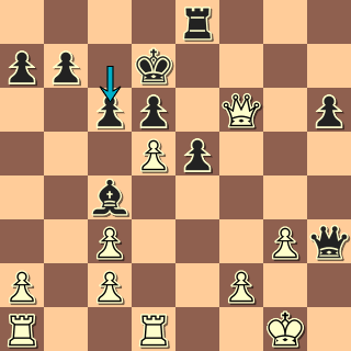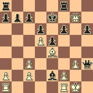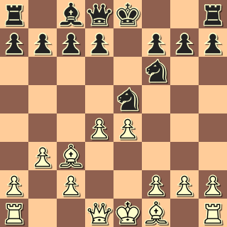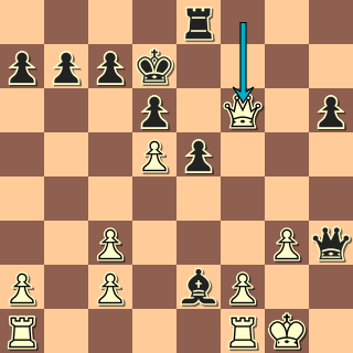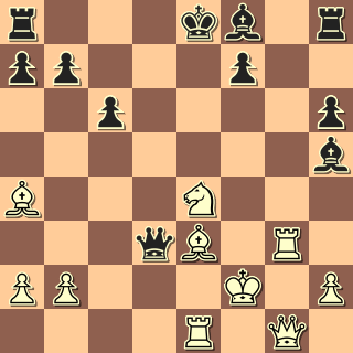 Oba borci zvolili bělopolnou strategii a hleděli hlavně na soupeřova krále. Výhodu má černý: po 1. … Vf7 musí dáma ustoupit a černý může suše dobrat kvalitu nebo zapojit do útoku další věž. 1. … Ke8?? Těžko pochopitelný blundr. 2. Sg6+! Kd8 3. Dxf8+ Kd7 4. Se8+?? Bílý se revanšuje. 4. Df7+ Kd8 znamenalo 5. De8 mat! 4. … Vxe8 5. Dxf6