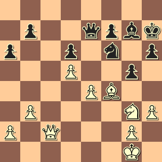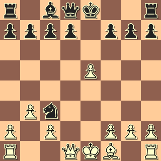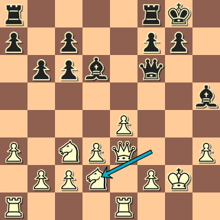 Pozice obou králů je neradostná, černý je však ohrožen víc (vývin, vývin!). Statečně nebo bláhově se rozhodl dobrat koně tahem 1. … Dxe4 (alternativou bylo se vzdát) a bílý mohl zaznamenat bod po 2. Sd4. Vazbu dámy ke králi viděl, odtah si však vybral špatně: 2. Sxh6? Sc5+!