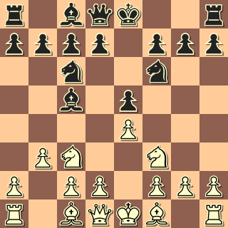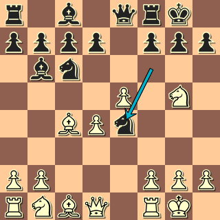 Černý má tedy figuru. Bílý má pěkný střed a dvojici střelců, neměla by to však být dostatečná kompenzace. Napadeným koněm je záhodno ustoupit; nebo je tu něco lepšího? 8. … Jxe4?? 9. dxe5 Jxc3