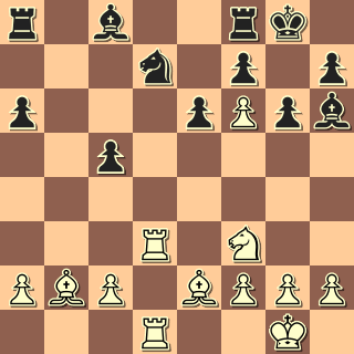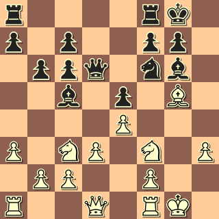 Tahle pozice si vysloveně říká o pečlivější rozbor a stanovení dalšího plánu. Bude se hrát na královském křídle a černý se asi neobejde bez postupu f7-f5, kterým uvede do hry své věže. 1. … Jh5 Za pozornost stála vazba po 1. … Sh5. 2. Vfe1 De6 3. Kg2 Jf4+? (3. … f5!) Výměna oslabuje postavení černého v centru. 4. Sxf4 exf4 5. Jh4 Dd6 6. Dg4 Dd4 Lehce naivní hrozba, ale díky aspoň za nějaký nápad. 7. Dxf4 Sd6 8. De3 Df6 9. Jf3 Bílý tedy získal pěšce, černý trochu otevřel pozici pro svou dvojici střelců a může zkoušet zlobit. 9. … Sh5 10. Jd2??