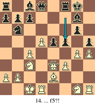 Bílý stojí dobře, čemuž ještě pomáhá poslední zřejmě příliš odvážný tah černého 14. … f5?!. Přišlo 15. gxh5 f4, to černý musí, jinak bych zahrál f4 já a pěšec na h5 by se těžko bránil. Tah 16. Df2 kryje pěšce na h4, což se při vývinu koně z g1 na h3 a posléze na g5 může hodit. 16. … gxh5 17. c5 zahání černého jezdce a znesnadňuje vývin černých figur. Zároveň se uvolňuje pole c4 pro bílého střelce. 17. … Jd7 18. Jh3 b6 19. cxb6 možná ještě lepší je zahrát c6, neboť se neotevře a sloupec pro černou věž, díky čemuž by byla slabší i protihra černého. 19. … axb6 20. Jg5 Jc5 21. Sc4 Sf5