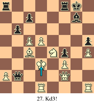 Bílý si může dovolit i 27. Kd3!, zejména díky skvělému jezdci na e4. Samozřejmě mohl hrát i 27. Ke1, načež by mohlo přijít 27. …Db4+ 28. Jd2 Sc3 29. Sc3 a bílý stojí na výhru. Aby mohl černý dále útočit musí obětovat další materiál. 27. … Va3+ 28. Sb3 Vxb3+ 29. axb3 Dxb3+ 30. Kd2 Šlo i 30. Ke2. 30. …Va8 31. Ke1 Va2 32. Jd2 Sc3? Místo tahu v partii mohl černý získat kvalitu nazpátek po 32. … Vxd2! 33. Vxd2 Db1+ 34.Ke2 Dxh1, nebo 34. …Db5+ 35. Vd3 Db2+ 36. Kf1 Dxd3, po čemž má černý asi nejhratelnější pozici, bílému zbyla kvalita navíc.Pokud by bílý namísto zmíněného tahu Ke2 zahrál 34. Vd1 mělo by přijít 34. … Sc3+ 35. Ke2 Dc2+ 36. Kf1 Dxd1 37. Kg2 Dxd5 38. cxb6 cxb6 39. Dxb6 a bílý má kvalitu víc, ale dovést partii k vítězství nebude vůbec snadné. 33. Vg1+ Kh7
