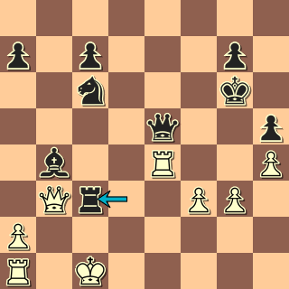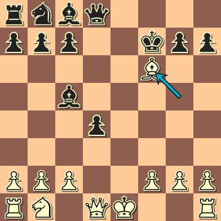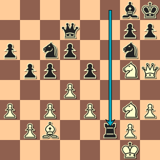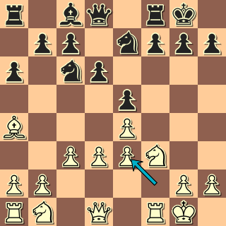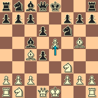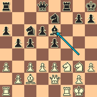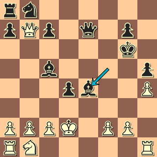 To měla být možná pointa – po braní dámou nebo pěšcem by bílý vyšachoval černého střelce (11. Dh5+). 10. … Kxf6! Bílý bude mít na útok jen dámu, ta sama nic nezmůže. 11. Df3+ Kg6 12. h4 (12. 0-0!) 12. … h5 13. De4+? Sf5 14. Dxb7 Pikožroutství bude potrestáno. 14. … De7+ Je po rochádě. 15. Kd2 Se4