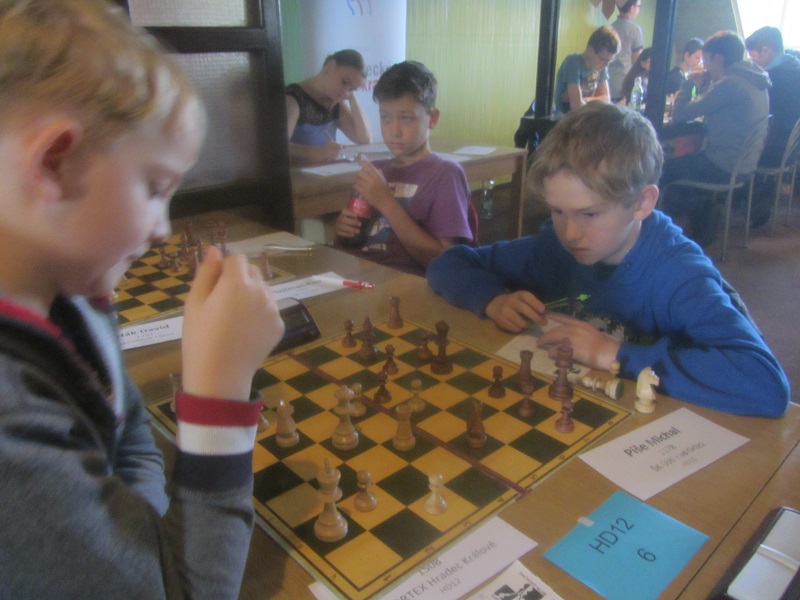 Dnes 4/7, pokračujeme v plusové bilanci! Míša hrál se známým hradeckým hráčem Rokošem (1508) a musel se bránit, soupeř měl postouplého pe5 a vyvíjel aktivitu hlavně na královské křídlo. Těžká partie, prohra nemusí mrzet. Kačka se konečně chytila, sice měla nějaké pěšcové slabiny, ale v koncovce dostala soupeře na vazbu, soustředěný výkon! Verunka hrála s poděbradským Novotným (1501) symetrickou pozici, zkazila ji až v koncovce, škoda.