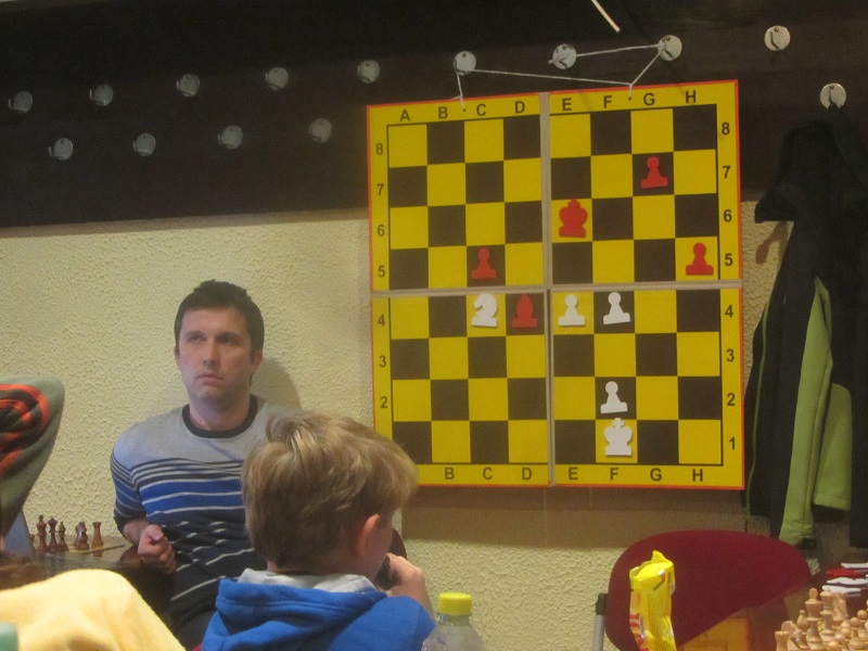 Dole jsme měli tři hráče na předních šesti deskách. Vojta na druhé měl silného soupeře, v bleskovém tempu (Vojta: „V jakým bleskovým tempu? – to bylo typický rapidový!“) s ním držel krok, byť měl pasívního střelce, koncovku ale neudržel. Vítek přestál přepad soupeře (po zahájení měl jako černý krále kdesi na f6) a sám si zaútočil na krále v centru, pěkně. Jirka zase předvedl promyšlený útok na krále po rochádě, skvěle! Zítra budou hrát na prvních dvou deskách! Partie možná budou.