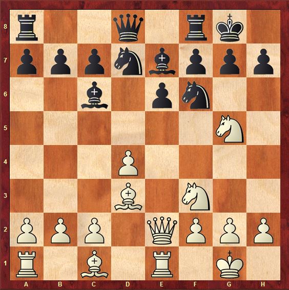 V partii s Anežkou Vlkovou se rozehrála francouzská, ale v této pozici přišlo g6? a pak klasický obrat 11. Jxe6 Sxf3 12. gxf3 fxe6 13. Dxe6 Kh8 14. Dxe7 a Verča je bez dvou pěšců, ale bojuje dál!