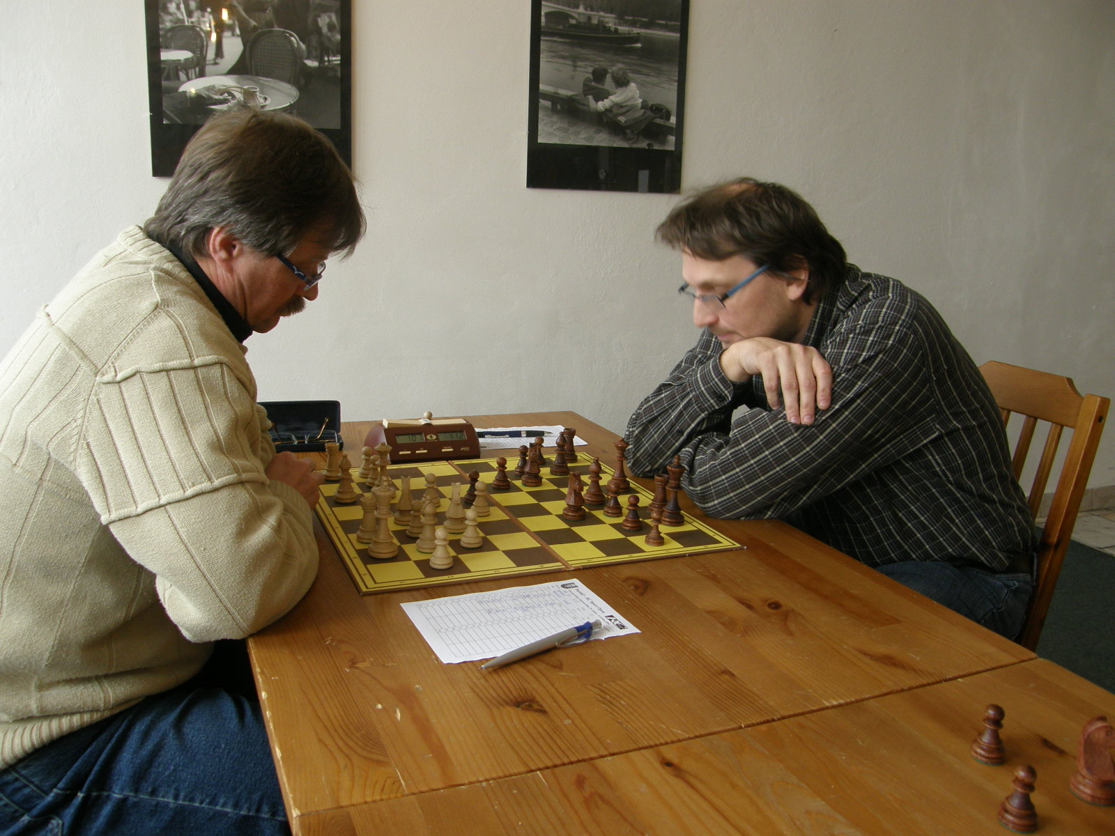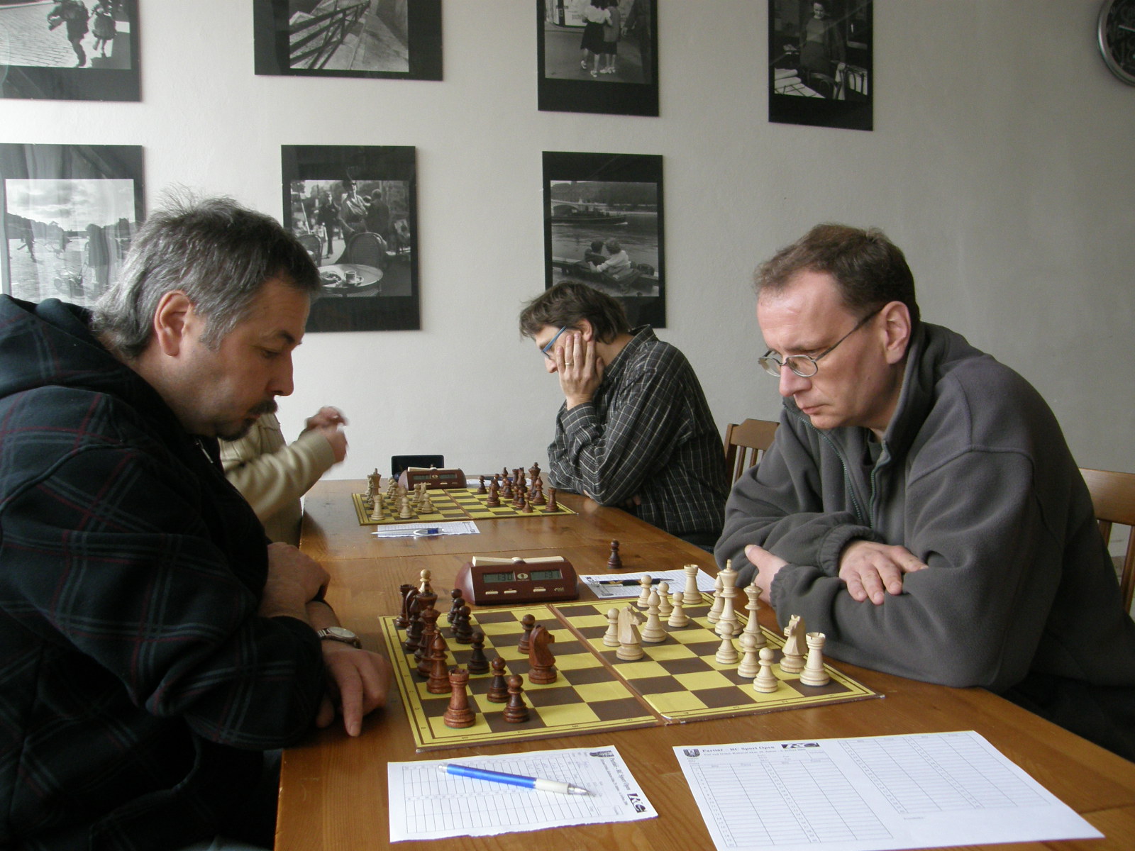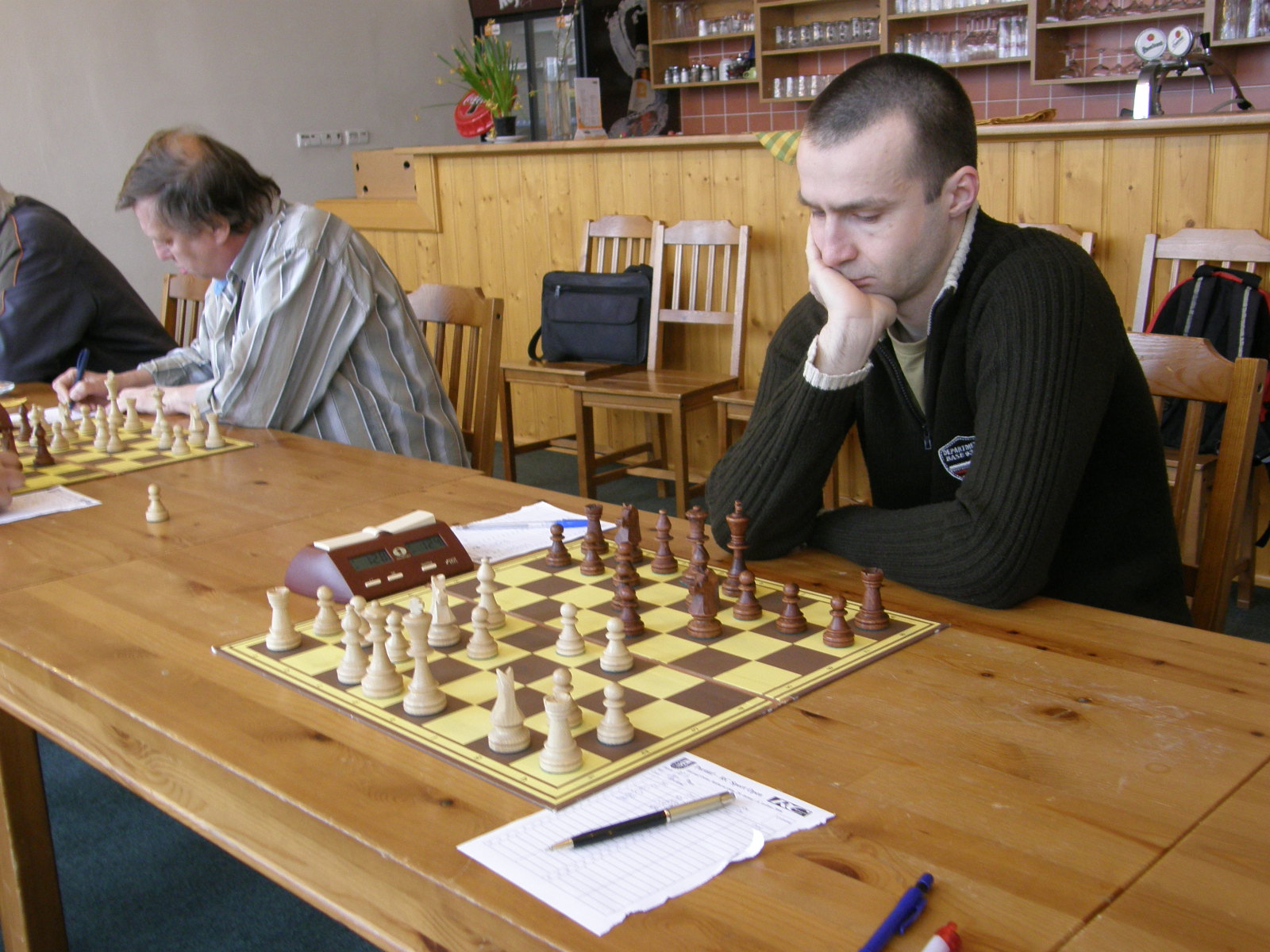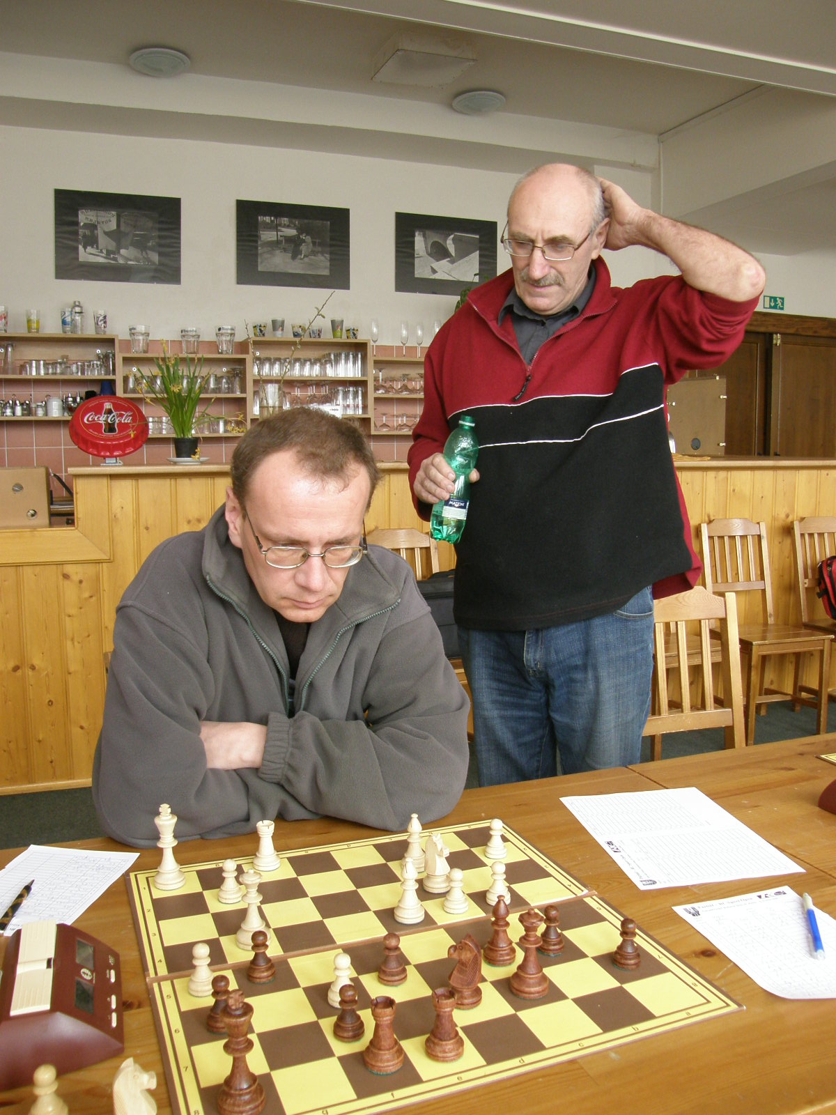 Asi se dalo čekat, že nejlítější boje budou svedeny na prvých dvou šachovnicích, kde soupeř disponuje těžkotonážním duem Pokorný, Solil. Předem bych rád vysekl poklonu PETRU MAREŠOVI a PAVLU KYLAROVI, k partii přistoupili oba zodpovědně a bojovali vpravdě statečně. Pavel po drobné předstartovní nervozitě („e4 c5 Je2, co na to mám sakra hrát?!“) postavil pevnou sicilku, nicméně bílý nechtěl ofenzivní choutky opustit a s prostorovou převahou v zádech hnal se do útoku rázného. Po prosazení e5 se mi jevila černá pozice na ručník, ale náš „Vata“ zatnul zuby, útočné pokusy poodrážel a dostal se do komplikované pozice V,J a floci na každé straně a obou křídlech, v níž asi nestál hůř (dokonce snad pěšec víc?). Pak bohužel přišla v kisně minela, jak už to tak bývá, když má člověk málo času a komplikovanou pozici. Roman natahal b a c floka vstříc proměně a na druhé straně, přes celkovou materiální rovnováhu, náš borec adekvátní protihru neměl… 2,5:4,5 a vymalováno v náš neprospěch.
