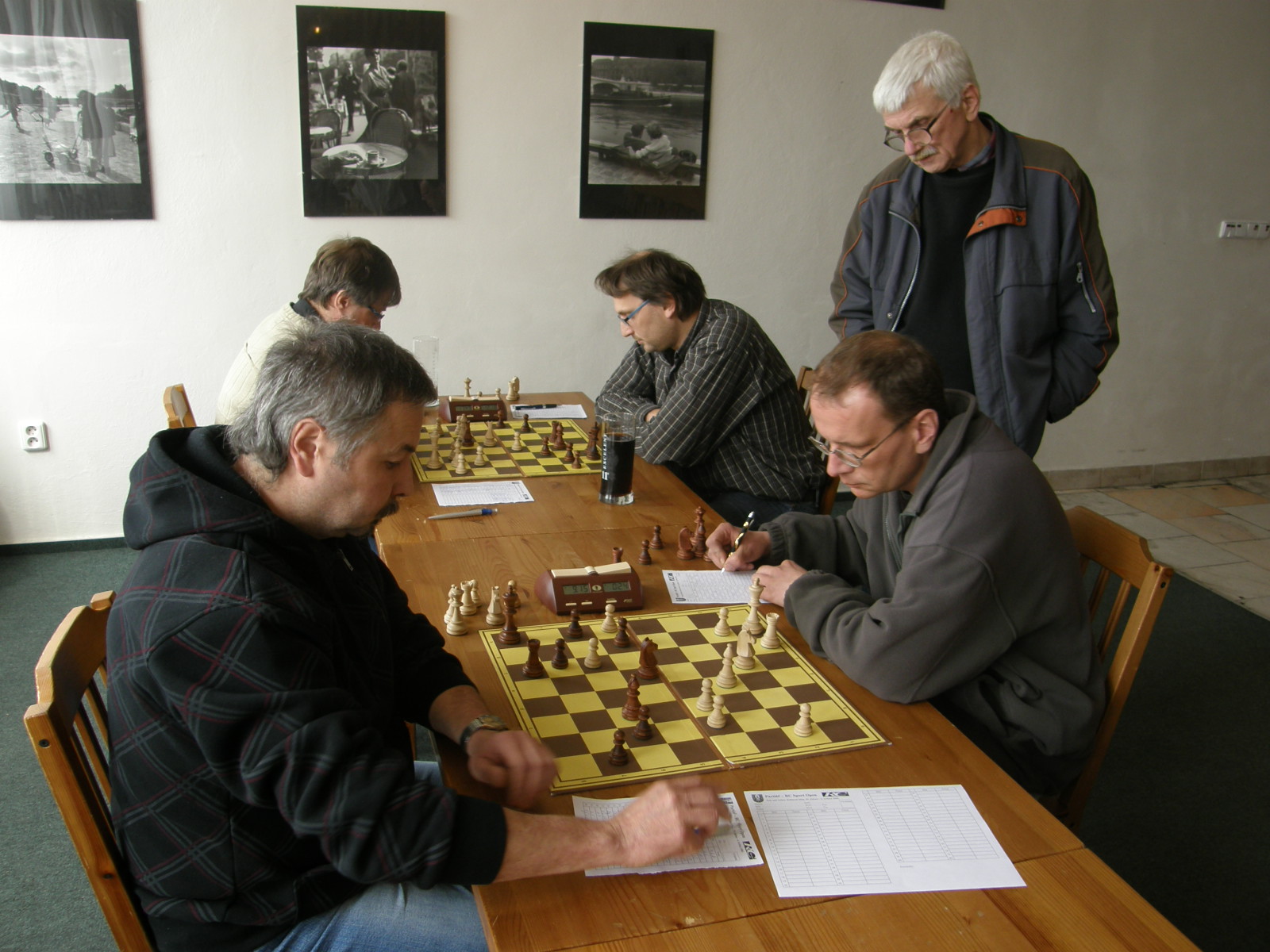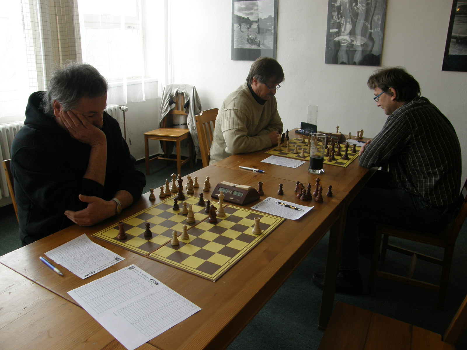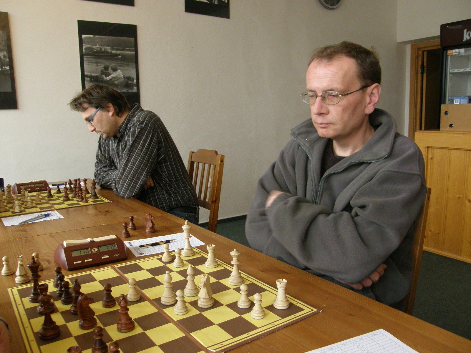 Opět jako čtvrtý (už se to stává pravidlem) jsem dokoulel já. Bylo mi jasné, že narazím už potřetí na LÁĎU ŠILARA, ale na přípravu nějak nebyl čas (z Říček, kde jsme lyžařům na zakončení sezony vyhrávali s kapelou dlouho do noci, jsem přijel až ve tři, teda čtyři ráno :-). Na třetí šachovnici se dle očekávání vyskytla francouzská s 3. Jd2 de4, kde se černý proti partii z před dvou let polepšil a poměrně brzy nasadil c5. Snažil jsem se to tahat na prostorovou převahu, trojblok těžkých figur na d sloupci a silná bílá pole, nicméně soupeř si vytyčený cíl pohlídal, pozici vhodně naředil (a dokonce možná přešel kolem zajímavého zvedáku Sa4, který mi ukázal až Fritz a v mém propočtu během partie jaksi nefiguroval :D). Takže z dosti nezáživných šachů rezultovala tupá koncovka dam a nestejných střelců, kde jsem kvůli horšímu času a slabým černým polím raději jistil plichtu – 2:3.
