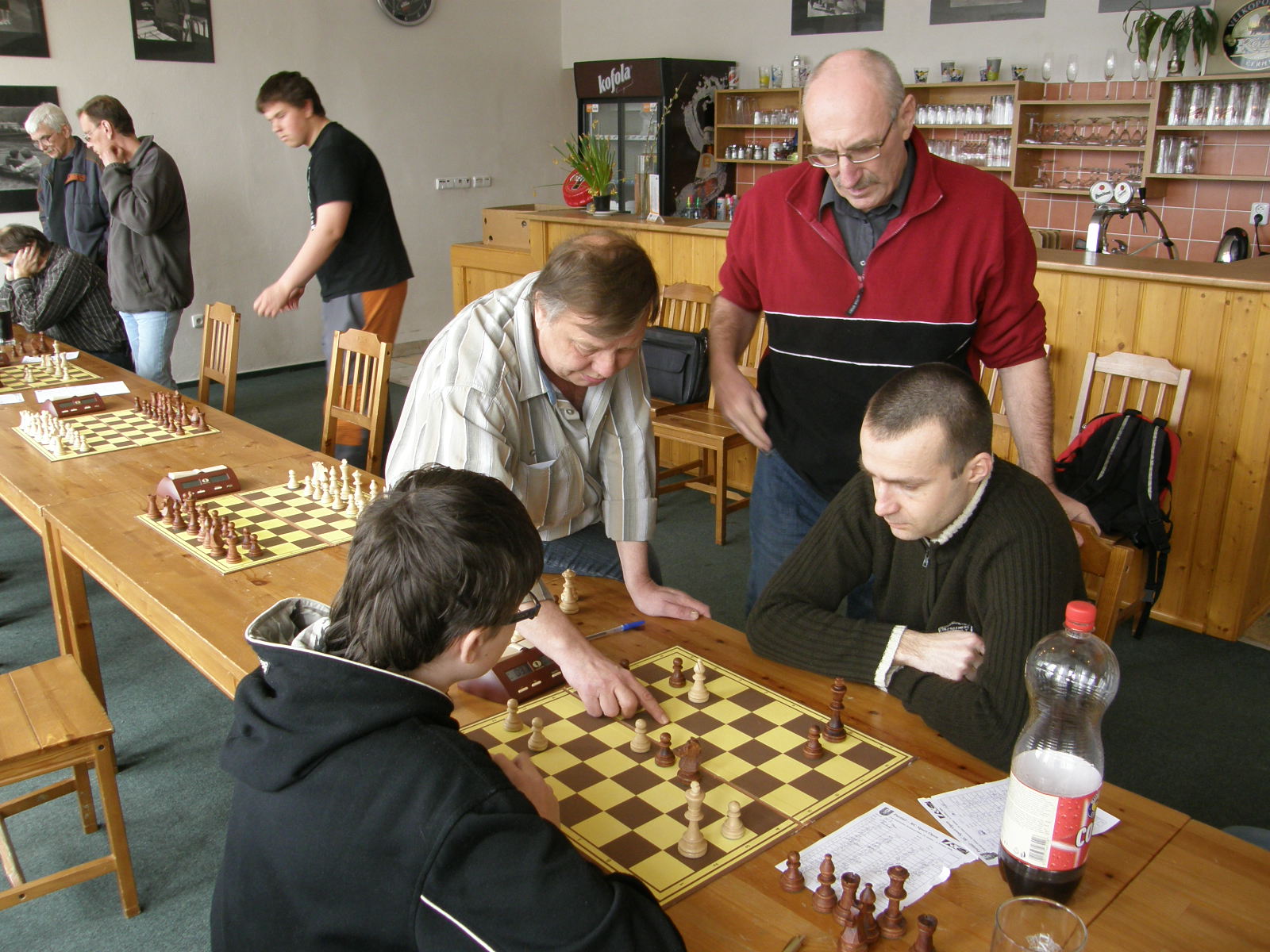 A na samotný závěr náš „number one“. Petr, který o soutěž výš kosí, koho potká, postavil proti TOMÁŠI POKORNÉMU tradiční boudu. Naštěstí se poučil z nehezkých pozic, do nichž se už párkrát s nejsilnějším Lanškrounským dostal, natáhl c4 a vznikla velice zajímavá hra. Náš lídr musel dát kvalitu za pěšce, ale přes materiální deficit pozici zesílil, vytvořil si silného krytého pěšce na e6 (snad se nepletu), kterého vhodně podporovaly figury. No bylo mi jasné, že tahle pozice se bude tahat hodně moc dlouho, u Tomáše vcelku obvyklý jev. V kisně bohužel naše jednička asi uklouzla (jak mi aspoň vedle ve výčepu řekla), lanškrounský koncovkář oživil pasivní věž, jež se pořádně přihlásila o slovo, vydacíc se do bílého tábora. Nebezpeční pěšci Petrovi se už dál nepohnuli, černou pozici naopak jistilo ještě volné áčko – 2,5:5,5 konečný výsledek.