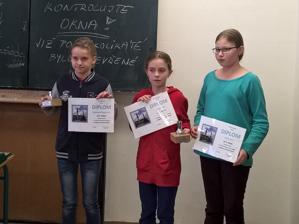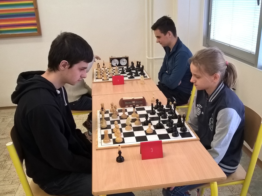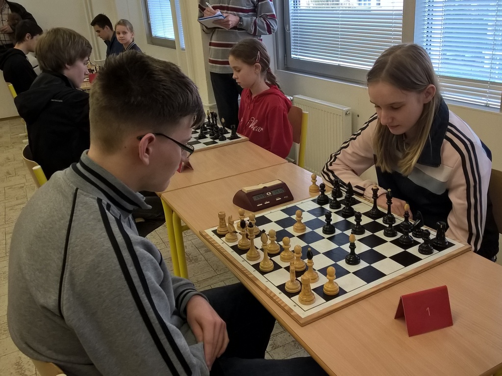 Hrálo se 7 kol tempem 15 min na partii, po úvodních snadných výhrách Domča v 2. kole nestačila na favorizovanou Magdu Kočí a měla se v dalších kolech soustředit hlavně na boj s její sestrou o 2. místo mezi dívkami o malou věž. Už ale tuto partii hrála velmi dobře, až chyba ve věžovce znamenala ztrátu partie. Pak se ale vzepjala k výbornému výkonu, další dvě partie vyhrála a dostala černými 3. nasazeného Vojtěcha Štaffu (ELO 1253). A nestačil jsem se divit. Ucelený výkon bez větších chyb, soupeře zcela přejela, nezaváhala a dotáhla partii až k matu. 4 body z 5 partií, průběžné 3. místo, získaná 4. VT a v 6. kole sestrovražedný duel na 1. šachovnici :-). Tam už to bylo tedy bez nároku, Verča spolehlivě přehrála všechny své soupeře a turnaj zakončila se 100% ziskem. Domča sice poslední partii nezvládla, tam už se zas hrubky nevyvarovala, nicméně i tak maximální spokojenost – konečně nebude na turnajích vždy v 1. kole dostávat jako poslední nasazená kontumáka :-).
