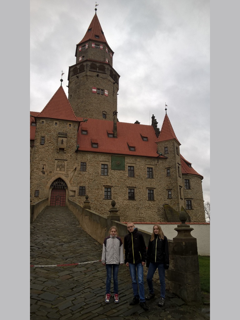 Po vyhlášení, kde si obě dvě odvezly hlavně cennou trofej, diplom, který v týdnu Verča doma vytvářela 🙂 + věcnou cenu, jsme vyrazili do centra Litovle, aby v reálu dítka viděla radniční věž nad řekou Moravou, která pořadatele inspirovala při pojmenovávání turnaje. Pak jsme se přesunuli na Bouzov, hláska byla bohužel kvůli počasí zavřená, tak jsme aspoň absolvovali prohlídku interiérů a nakonec jsme ještě zajeli do nedalekých Loštic do muzea tvarůžků. Výlet jsme zakončili po víc jak 12 hodinách zdárným návratem, pokud budeme zase za rok pozváni, tak určitě pojedeme :-).
