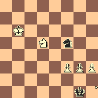 Stojím totálně na prohru a málem jsem se vzdal, ale to by byla chyba! 60. … Jd4 61. b6 Kd7 král se zoufale vrací, ale co mu taky jiného zbývá. 62. a6 Kc8 63 Jd6+ Kb8 64 Je4?! zbytečný tah dozadu, ale bílý je stále vyhraný. Mohlo přijít 64. a7+ Ka8 65 Je8 s následným Jc7 a bílý vítězí. 65. … Jf4 66. c6 g3+ šach z pomsty. 67. Kg2 Je3+ vždyť už je to jedno, ne? 68. Kxg3 Jc4 Počkat, napadám pěšce na b6 a toho černý nepokryje! Co má černý dělat?