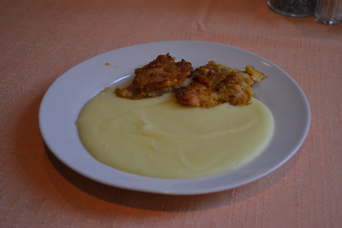 Polívka došla, čekám, až přinesou další. Přinesli, tu od večeře. Jdu si pro druhé jídlo, k masu dávají místo rýže už hranolky, to nevadí, tím líp … ale maso prý už došlo a dávají to v těstíčku, co bylo k večeři … a zrovna nedávají nic, fronta stojí … ne, fronta se rozhýbala a přijde na mě řada … ne, došla příloha … a co to nesou? Ano, téměř tradiční bramborová kaše.