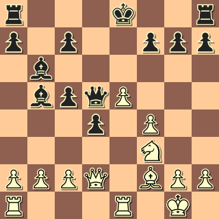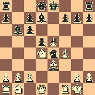 Z přednášky jsem si pamatoval, že to má být lepší než 0-0, ale už jsem zapomněl, jak čelit nástupu černých pěšců. A vymýšlet to ve dvacetiminutovce není úplně to pravé. S pocitem, že jdu poslušně pod nůž, jsem pokračoval 13. Jd2 Jxd2 14. Dxd2 c5 15. Jf3 d4 16. Sf2 Sb5 17. Vfe1 … a soupeř mě šokoval tahem Dd5??. (Teď nevím, jestli jsem nepřehodil tahy, jestli to nebyla rošáda, ale to je jedno.) Správné bylo, jak sám uvedl, 17. … Sc6.