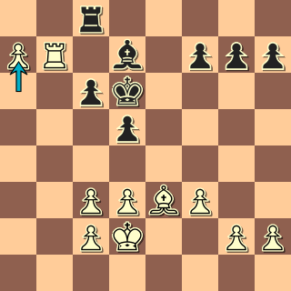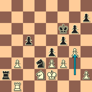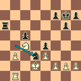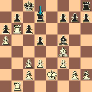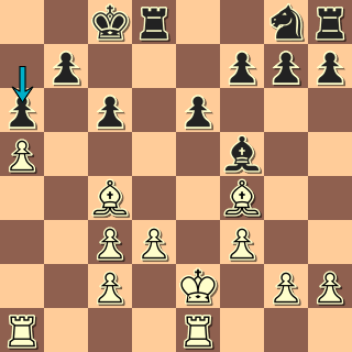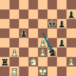V pozici diagramu má černý aktivnější figury a díky pěšci e4 prostorovou převahu, kompenzací bílé jsou slabí černí pěšci a6, c5. Kdyby se bílá dostala k dokončení vývinu a nějaké té výměně, mohla by uvažovat o výhodě. I proto jsem se pokusil hrát aktivně: 1. … a5!? Smyslem tahu je uplatnit věž e6 přesunutím na a6 (druhá věž má víc možností rozehrání), příp. se zbavit pěšcové slabiny postupem na a4. Tah je spojen i s malou léčkou, do níž bílá padá. 2. Jxa5? Va6 3. Jc4 Jxc2+! 4. Kd2?! (4. Vxc2?? Va1+; 4. Ke2!) Jb4 5. Va1 Vca8 6. Vxa6 Vxa6 7. Vb1 Jd3