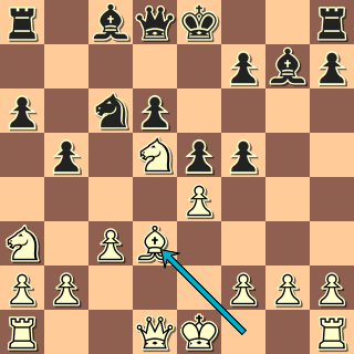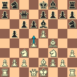 Protože visí pe4, je odpověď jasná – ale dobrá. 6. e5! Jg4? On visí pb5 se šachem, takže nelze ustoupit na d5. Jakžtakž hratelné však bylo 6. … dxe5 7. dxe5 b4. 7. h3 Jh6 8. Sf4 Se6?