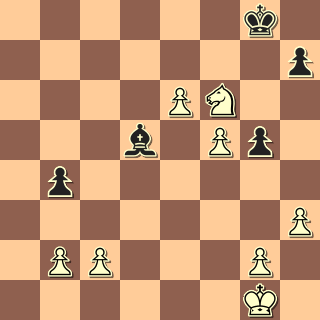 Kuriózní pozice, kde jsou oba jezdci na braní, ale žádného brát nelze, tedy, černého nešlo brát v minulém tahu.. 34. … Jg8? Po 34. … Jg6 bych se mohl opravit znovu 35. Jh6 nebo 35. Vxg6, ale asi bych hrál 35. Vh8+!! Jxh8 36. Jh6 s kýženým matem na g8. 35. Vh8 exf5 36. Vhxg8 mat.
