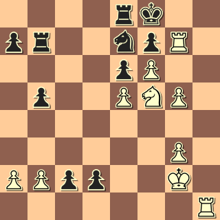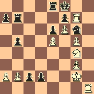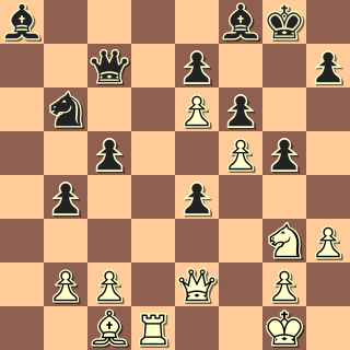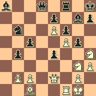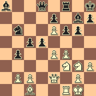 Zajímavá pozice, kde má černý dost šancí v centru a na dámském křídle, ale co král? 24. f5! Asi jediná šance na výhodu. 24. … dxe4 (24. … Dc7!) 25. Jh4!! To je ta myšlenka! 25. … g5? (25. … De8)