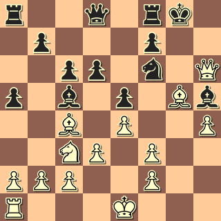 Tady jsem čekal, že se černý vzdá, ale začal ještě nápaditě mlžit. 18. … Sxf2+!? 19. Kxf2 Db6+ 20. Ke2?! (20. Se3!) Sg4!? 21. fxg4 Sxg4+ 22. Kf1 Šlo i prosté 22. Ke2 Df2+ 23. Je2 Dxe2+ 23. Kc3 +-. 22. … Sh3+ 23. Ke1 Dg1+ 24. Kd2 Oběť druhé věže jak od Anderssena. 24. …. Dg2+ 25. Je2 d5