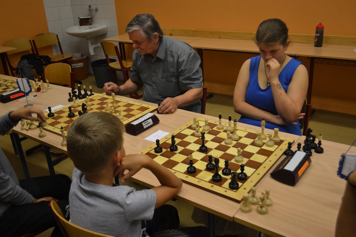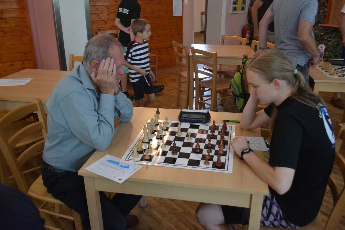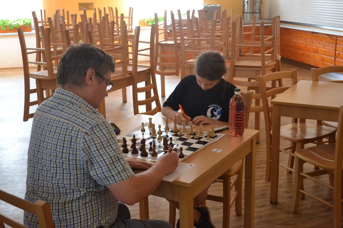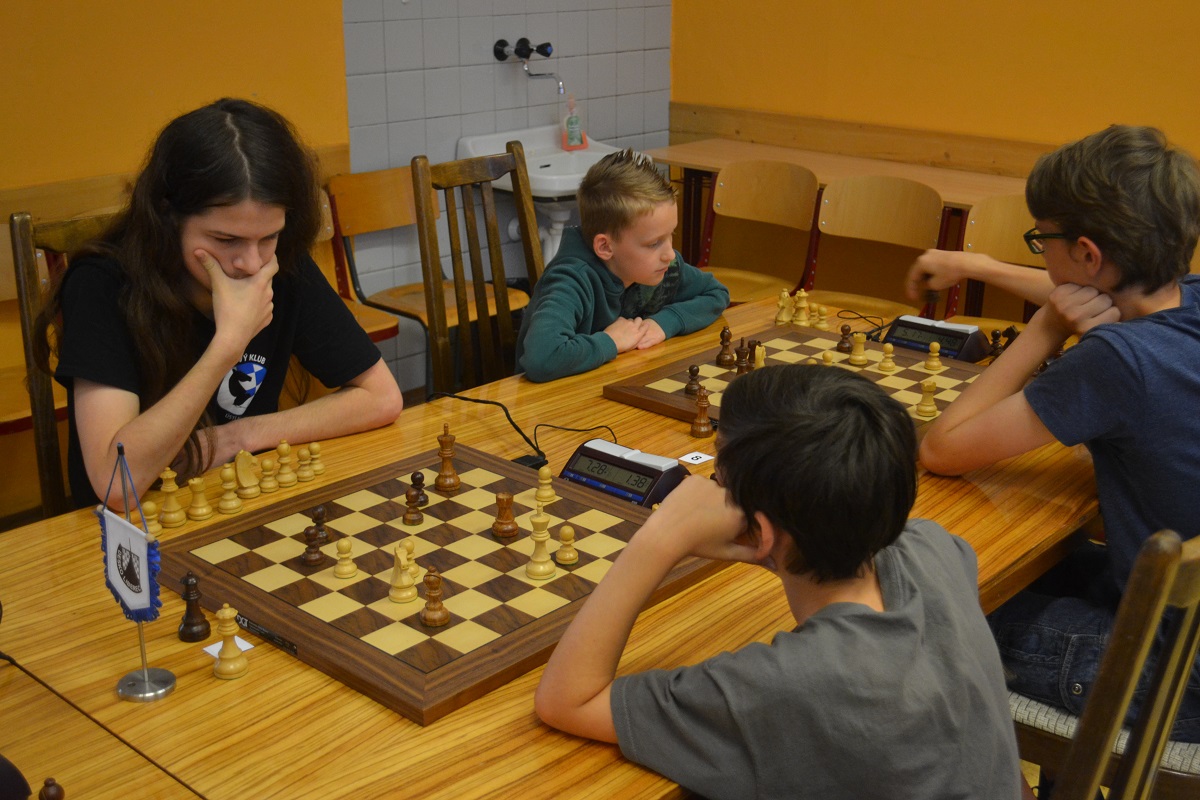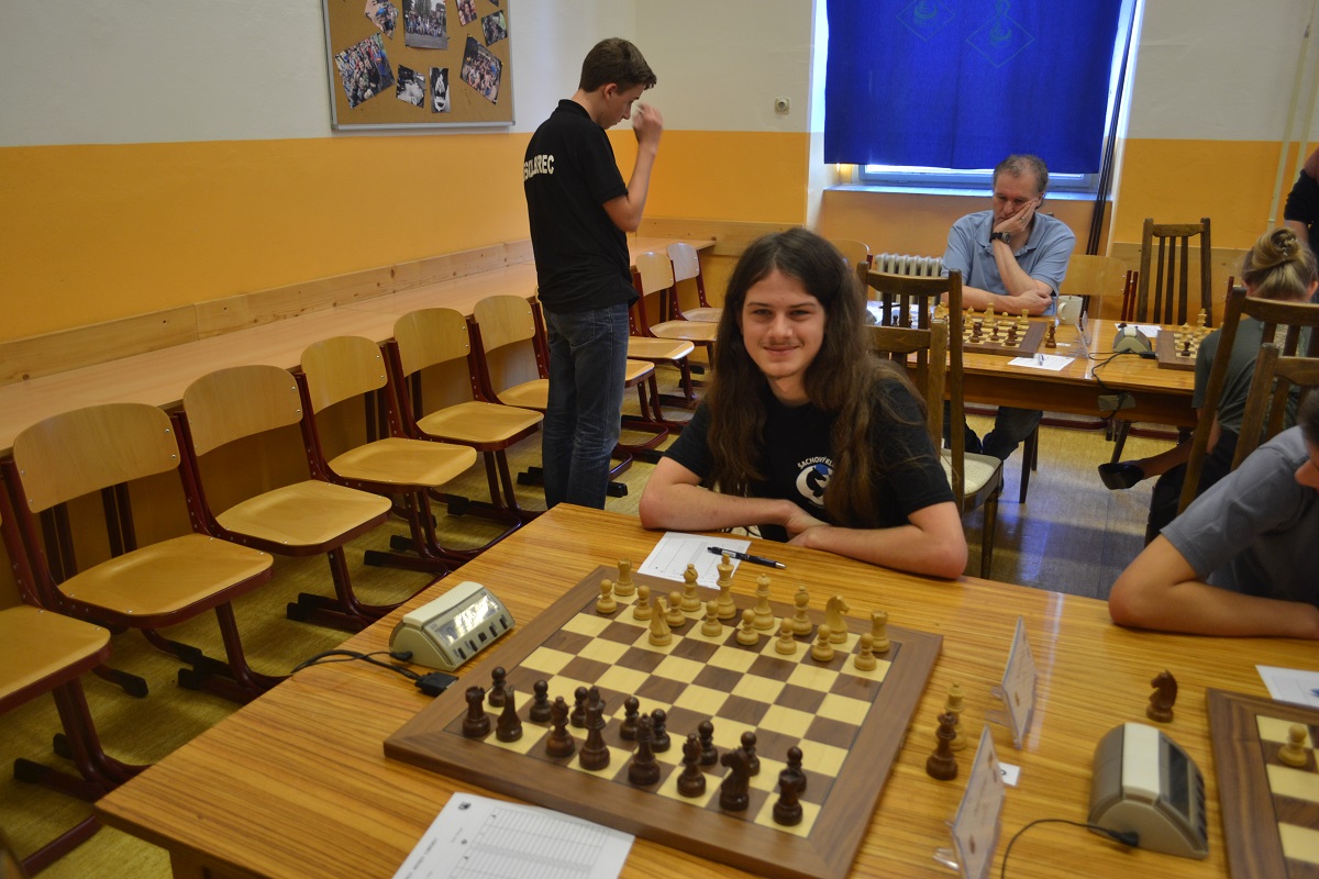 Větší hráli všichni černými a vedle sebe: Verča s Ondřejem Šedivým (1757) v nejdelší partii remízovala – měla pevnou, ale pasívní pozici, pak blokovanou koncovku na jednom křídle se stejnopoláky a čtyřmi věžemi a soupeř to zkoušel. Vojta poměrně rychle vyhrál, po výměně dam vysbíral soupeřovy slabiny. Vítek dal kratší půlku s Ondrou Hradeckým.
