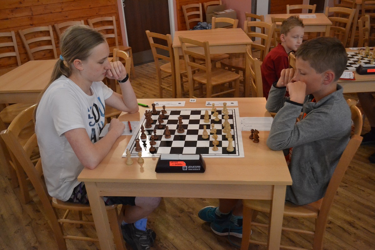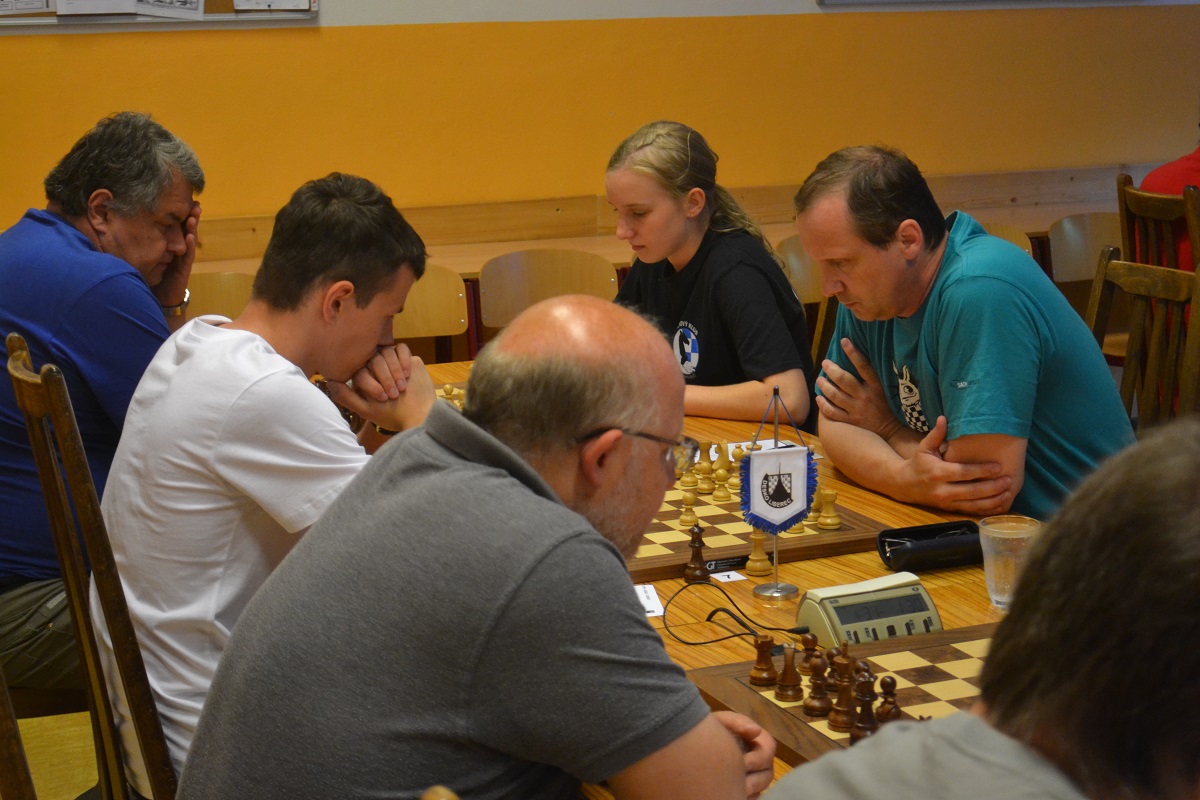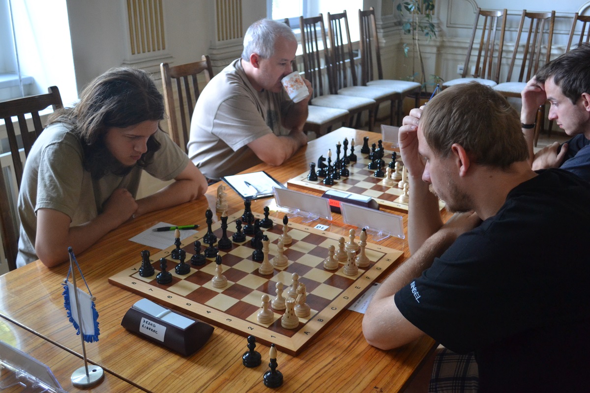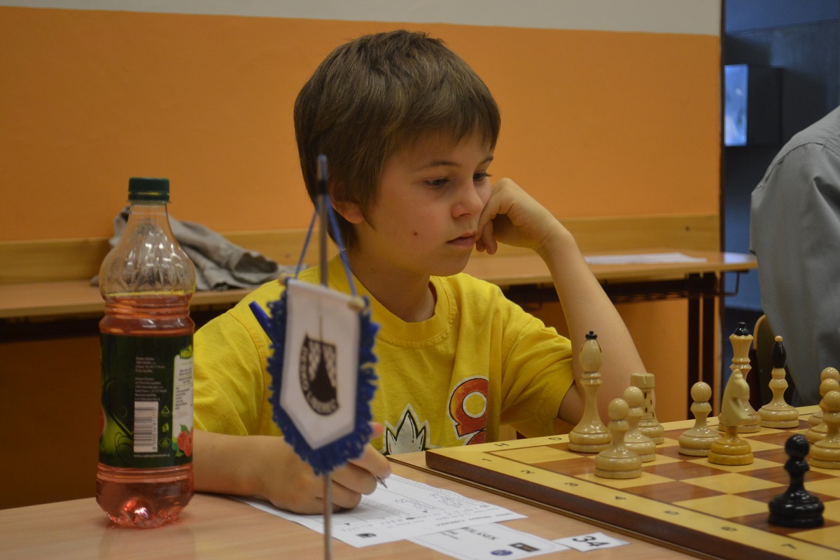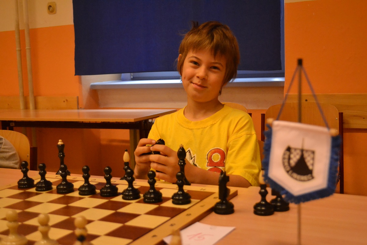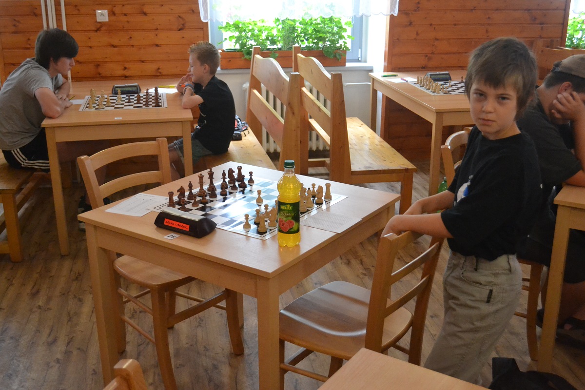 Větší hráli všichni černými a vedle sebe: Verča s Ondřejem Šedivým (1757) v nejdelší partii remízovala – měla pevnou, ale pasívní pozici, pak blokovanou koncovku na jednom křídle se stejnopoláky a čtyřmi věžemi a soupeř to zkoušel. Vojta poměrně rychle vyhrál, po výměně dam vysbíral soupeřovy slabiny. Vítek dal kratší půlku s Ondrou Hradeckým.