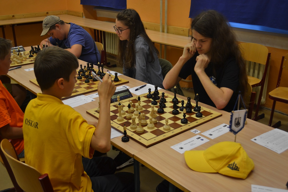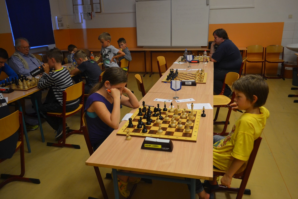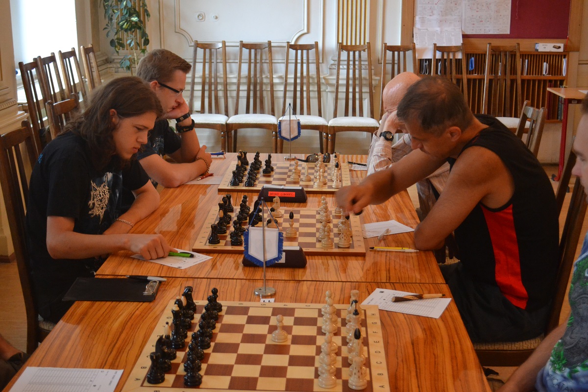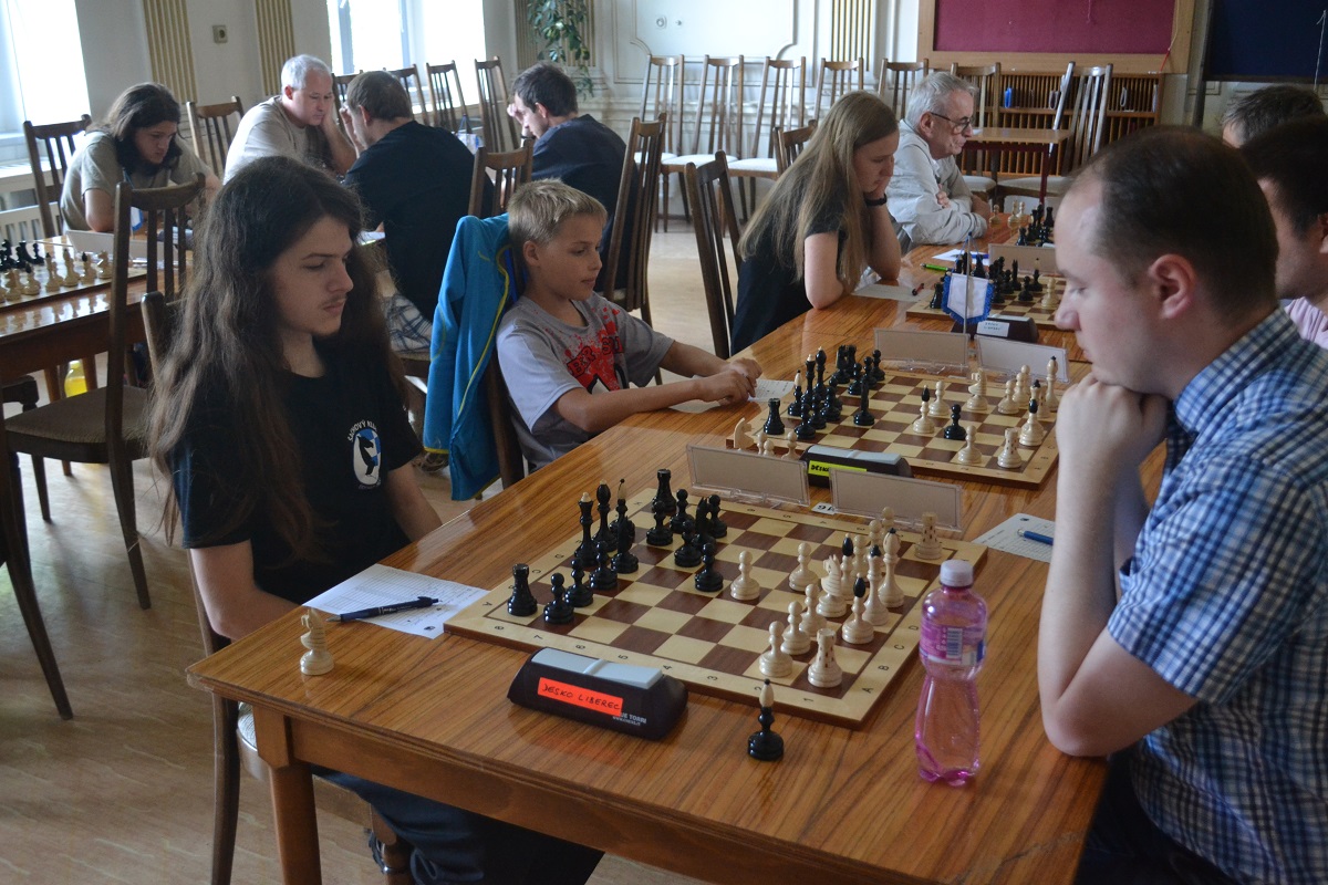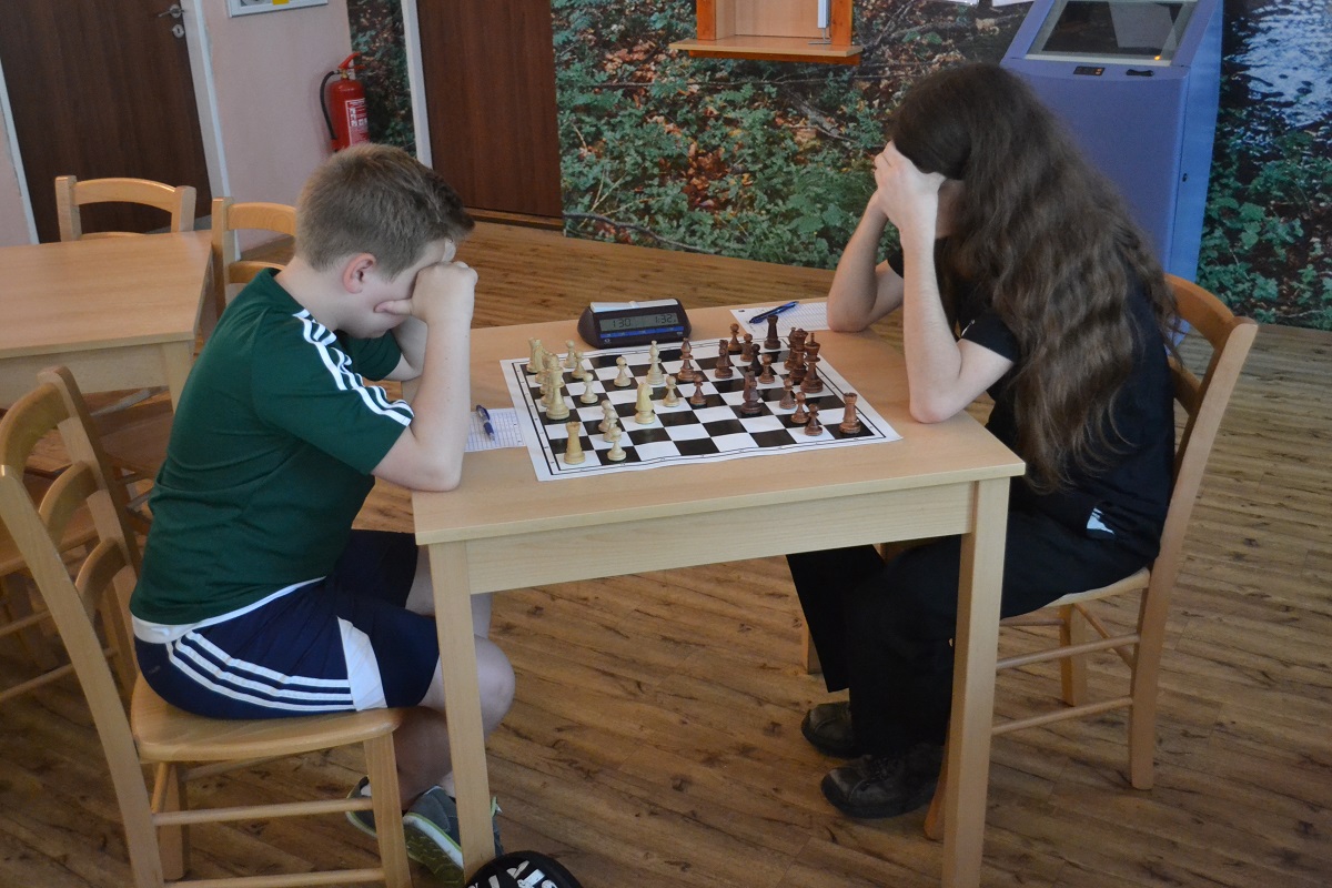 Větší hráli všichni černými a vedle sebe: Verča s Ondřejem Šedivým (1757) v nejdelší partii remízovala – měla pevnou, ale pasívní pozici, pak blokovanou koncovku na jednom křídle se stejnopoláky a čtyřmi věžemi a soupeř to zkoušel. Vojta poměrně rychle vyhrál, po výměně dam vysbíral soupeřovy slabiny. Vítek dal kratší půlku s Ondrou Hradeckým.