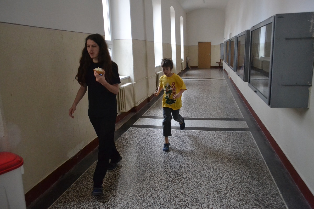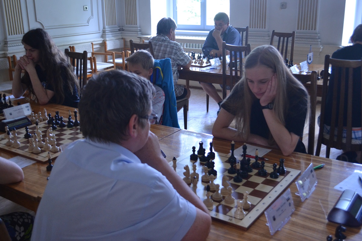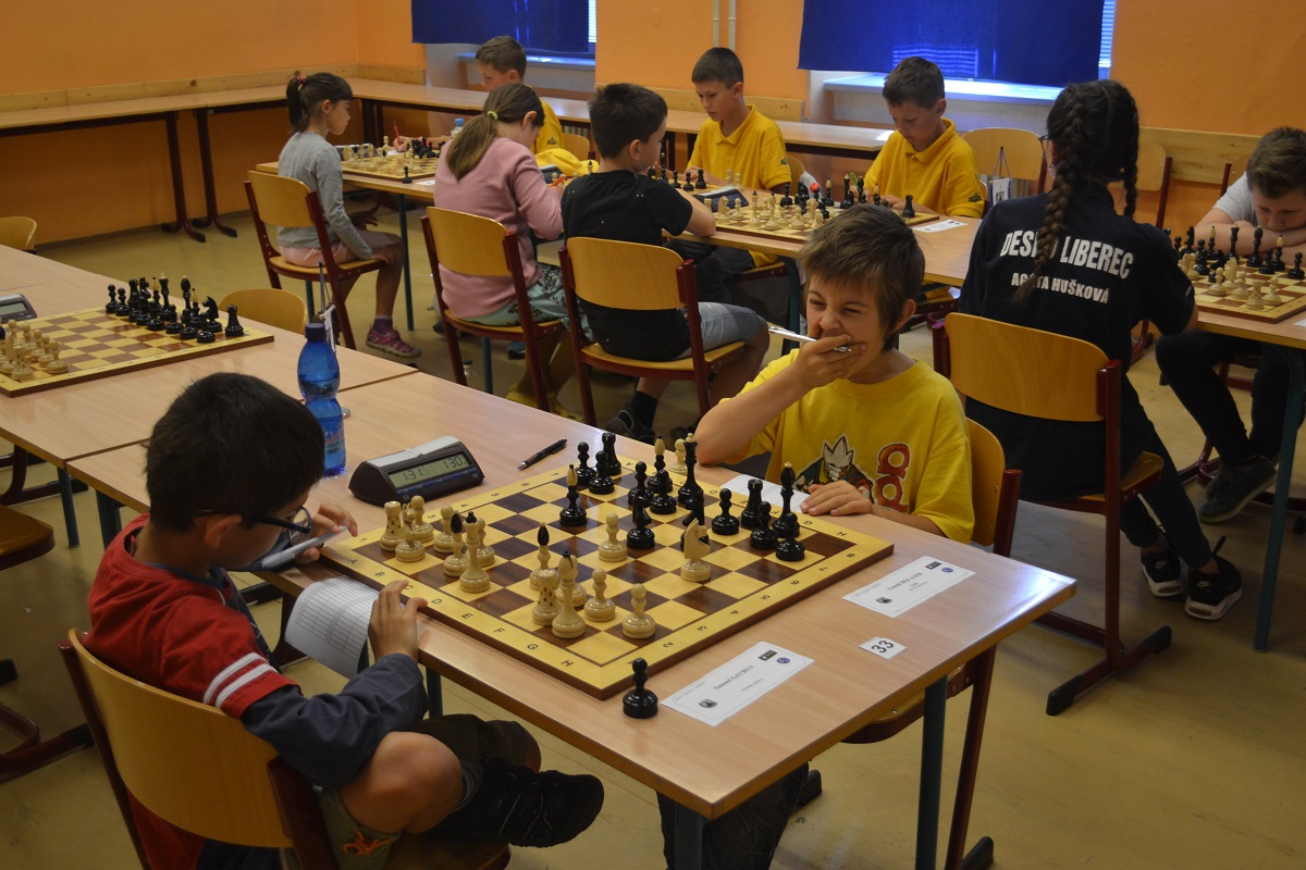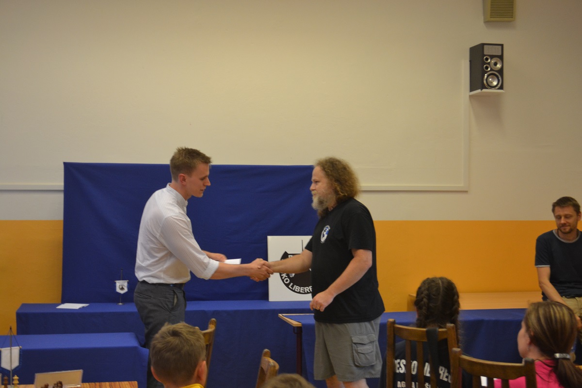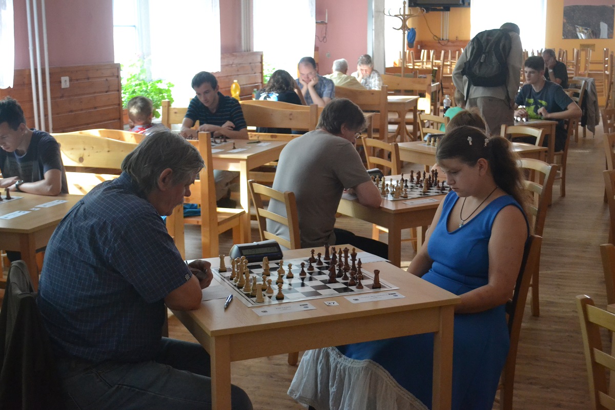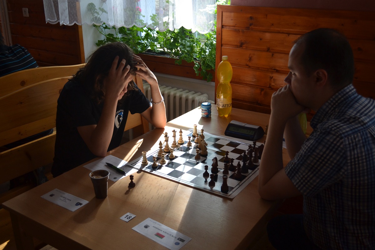 Větší hráli všichni černými a vedle sebe: Verča s Ondřejem Šedivým (1757) v nejdelší partii remízovala – měla pevnou, ale pasívní pozici, pak blokovanou koncovku na jednom křídle se stejnopoláky a čtyřmi věžemi a soupeř to zkoušel. Vojta poměrně rychle vyhrál, po výměně dam vysbíral soupeřovy slabiny. Vítek dal kratší půlku s Ondrou Hradeckým.