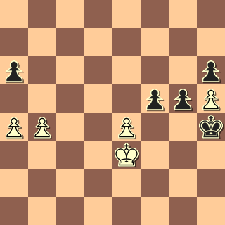 Podle mě, když jsem přihlížel, dávalo černému šanci jen 1. … Kh3! 2. b5 (2. exf5?! g4 3. f6 g3 4. f7 g2 5. f8D g1D+ je horší) axb5 3. axb5 f4+! 4. Kf2 Kh2 5. b6 g4 6. b7 g3+ 7. Ke2/f3 g2 8. b8D g1D 9. Dxf4+ Kh3, i když pořád je to nevábná koncovka. Jirka ale zahrál 1. … fxe4? a dámu si vůbec nepostavil.