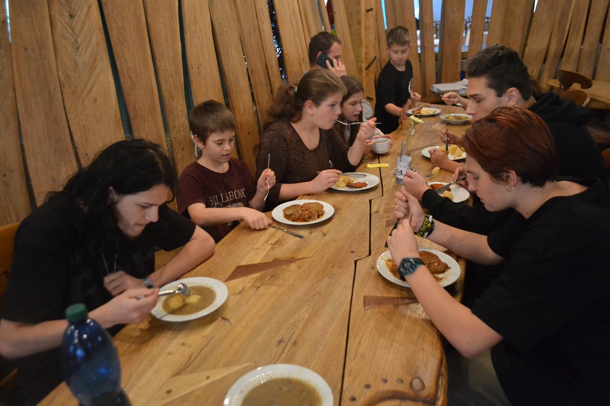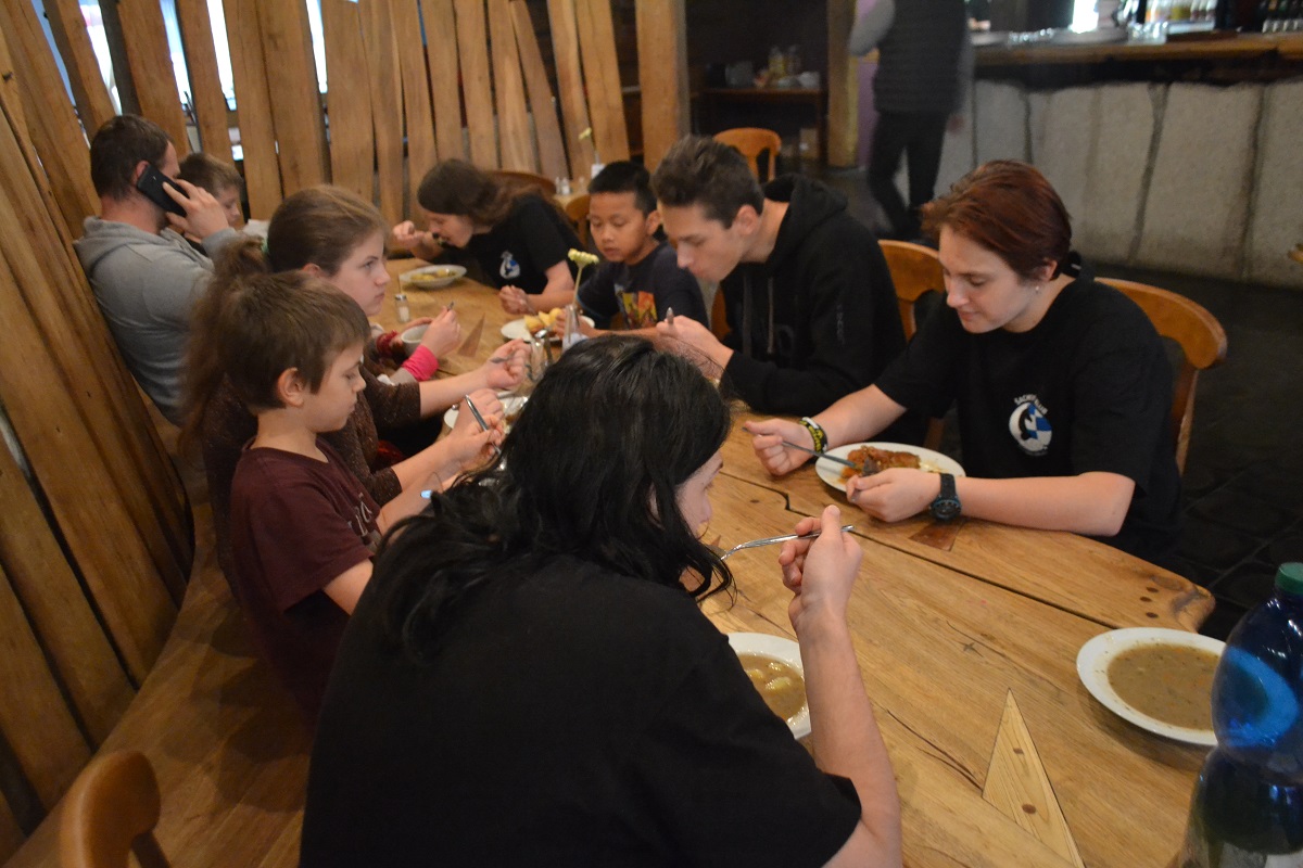 A zbývalo naposledy nostalgicky poobědvat, zajít na vyhlášení (na podium šla kromě Vítka a mě i Soňa, 6. místo v D14) a dobalit. Někteří nechtěli balit figurky, se kterýma celý týden hráli – trenére, starej se sám; pak byl problém poshánět partiáře, ponožky, zjistit, které triko je čí … Většinu výpravy zdárně dovezl pan Kobr, opět díky!