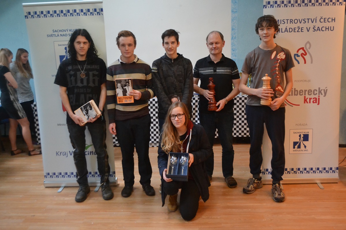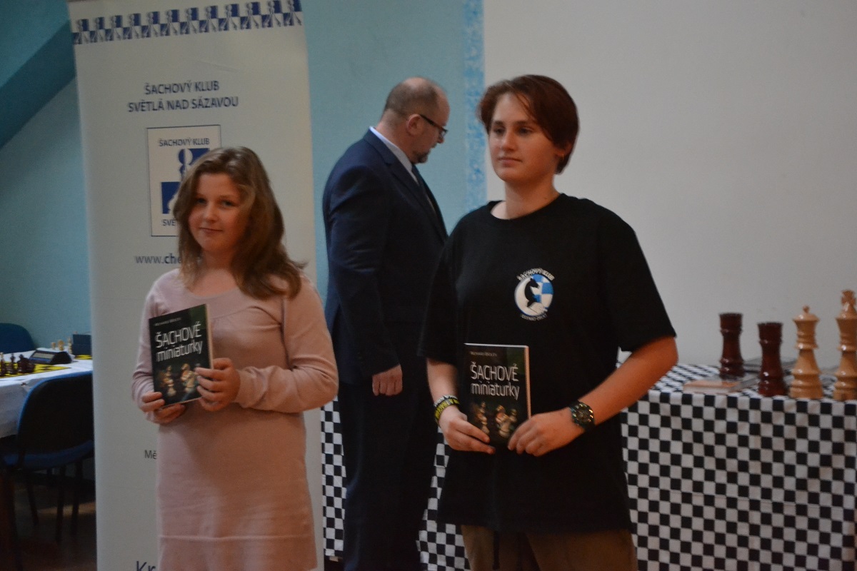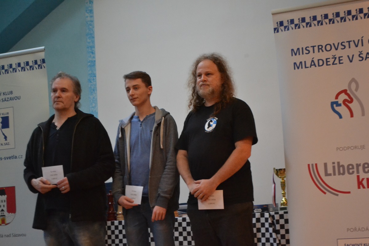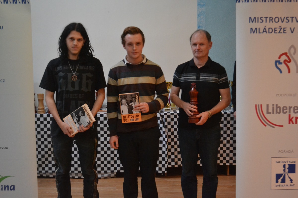 Perlička z vyhlášení: hoši na prvních třech místech se jistě těšili na finanční ceny, jenže co to, oni jim dali nějaké knížky, Matěji Kupsovi dokonce jen velkou šachovou figurku … ty úsměvy do objektivů působily hodně strnule 🙂 … renonc byl ale záhy napraven.