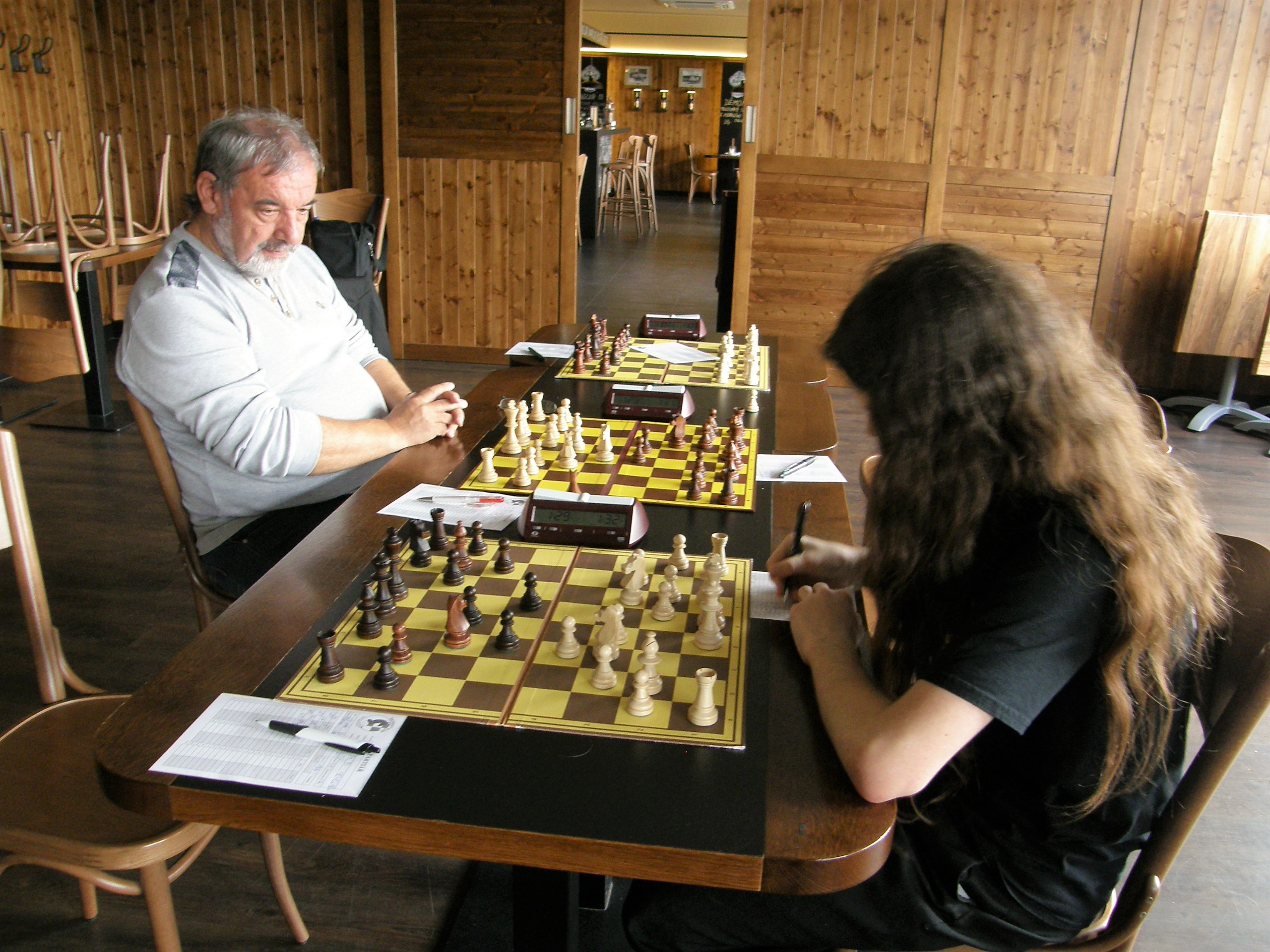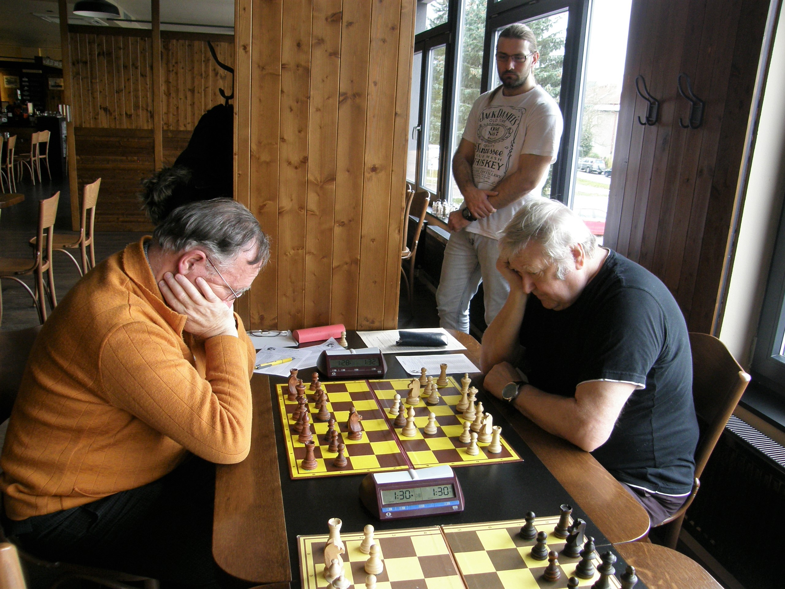 Na ústecké poměry se celkem bojuje (bez remízy do 10. tahu), na prvních dvou uvážlivě, na třetí zkouší Vlasta využít horší vývin Martina Poslušného. Já proti rozehranému Vojtovi Holáskovi stavím dobrou pozici, ale nevím co s ní a ztrácím čas, na pětce hledá brácha Vítek kompenzaci za floka, naše nová posila z Rychnova Jiří Daniel v klidu zesiluje a při minimu materiálu se hraje na dva výsledky. Nety na šesté černými trpělivě vylepšuje figurky s vidinou 2000 ELO bodů (které po letech znovu atakuje). No a na posledních dvou věřím, že body uděláme, ratingová převaha je přeci jen citelná.