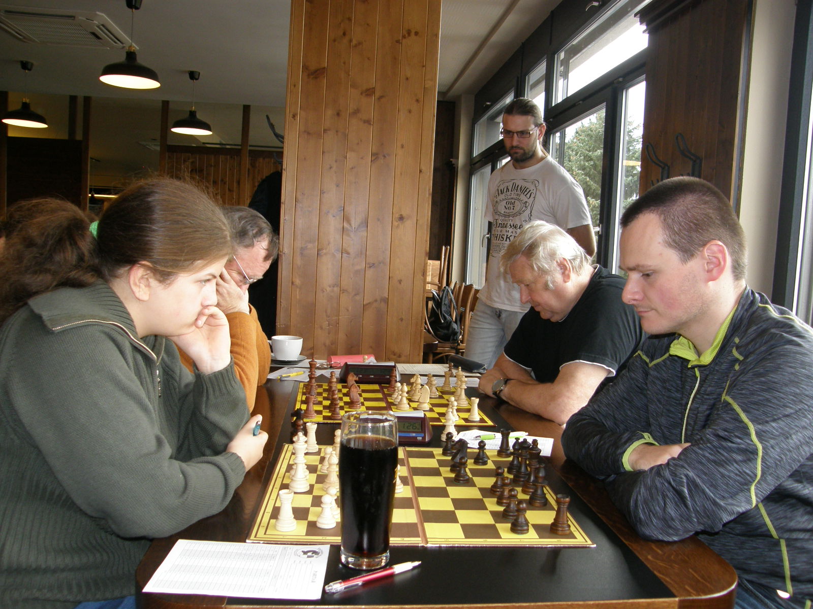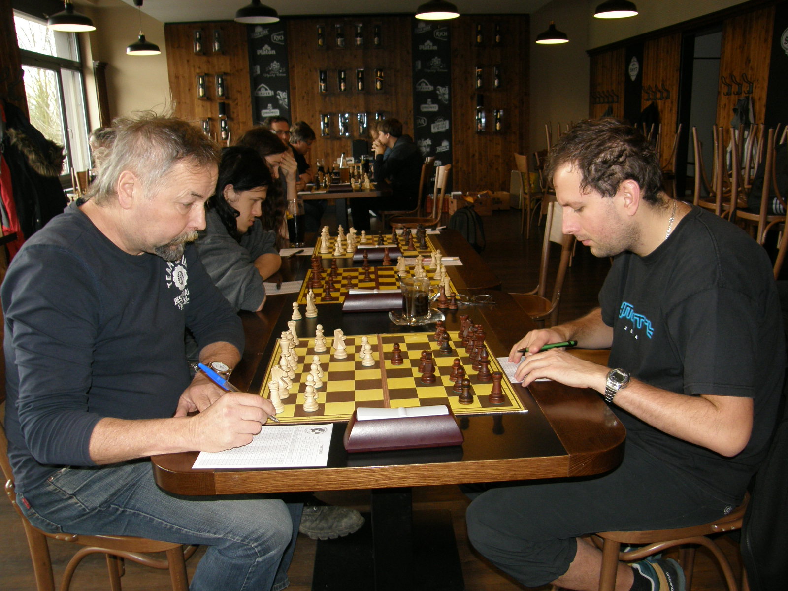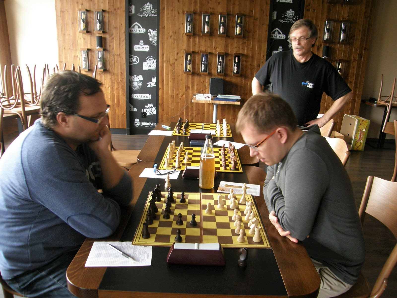 Na sedmé a osmé se také nakonec urodilo nejrychleji, nejprve Jarda Volf přetavil prostorovou převahu v převahu materiální, chvilku po něm dotáhl k bodu Zdenda Šimek pozičně dobře vedenou partii. Dvě remízy jsme poté přidali černými – nejprve Vašek Grundman (půlku Petru Marešovi odmítl, za pár tahů ji sám nabídl), pak já (stál jsem jako čuník a s výrazně horším časem, soupeř mě omilostnil). Poté ještě zapůlili Vlasta s Martinem, ten převedl podezřelou pozici do hratelné koncovky. Dohrávají se tak tři partie, na první máme kvalitu víc, na páté a šesté floka – to by mělo stačit.