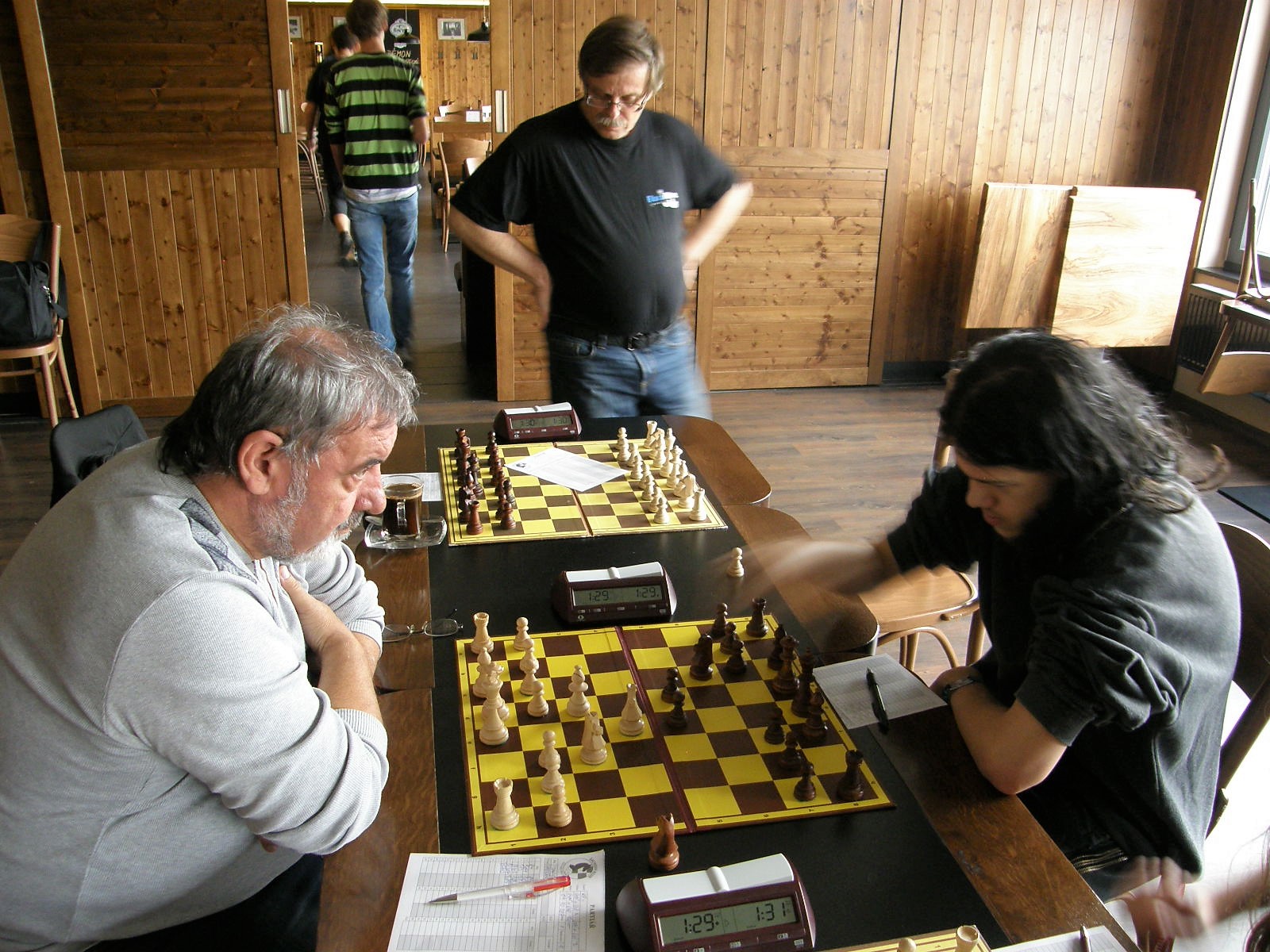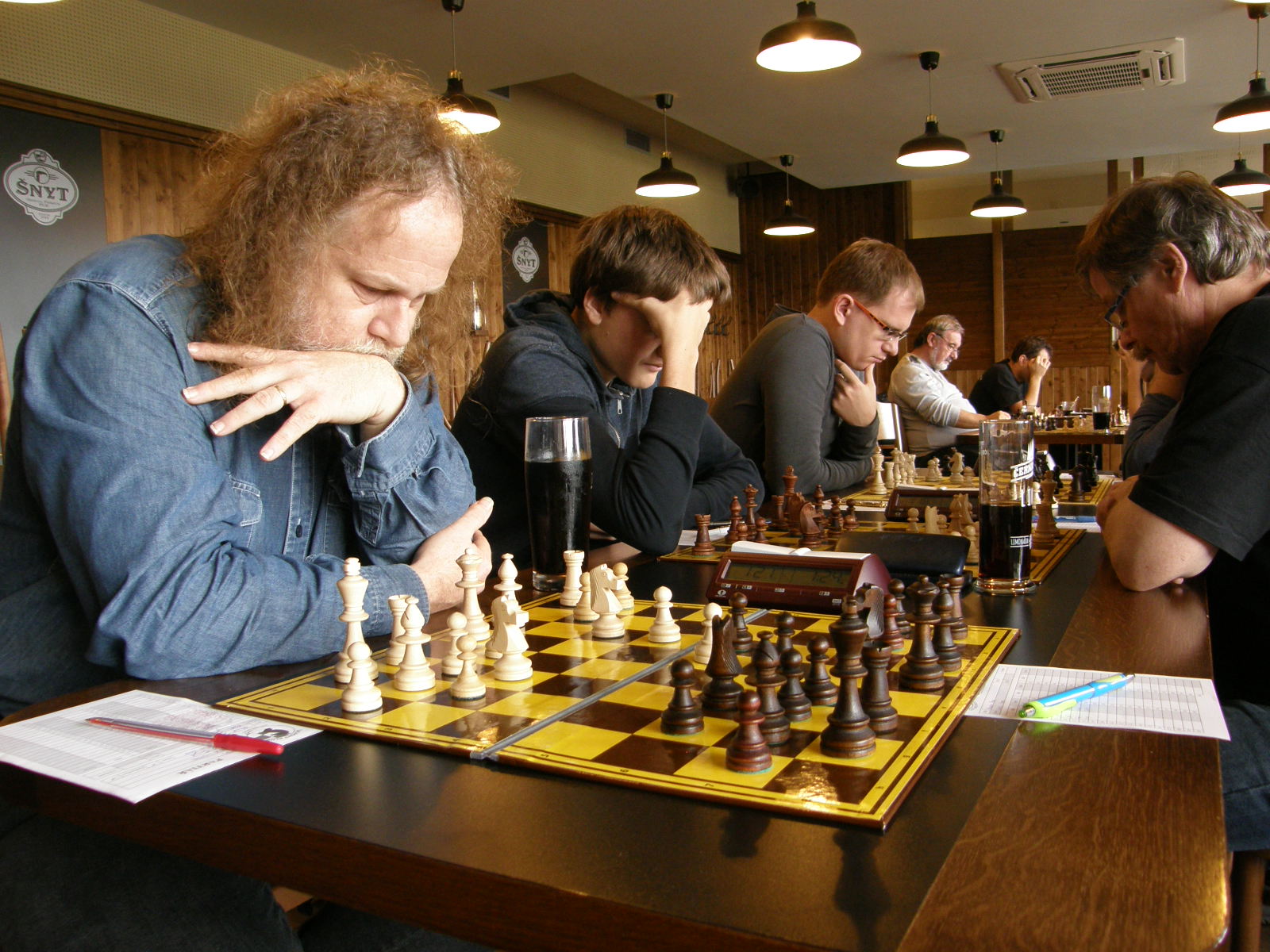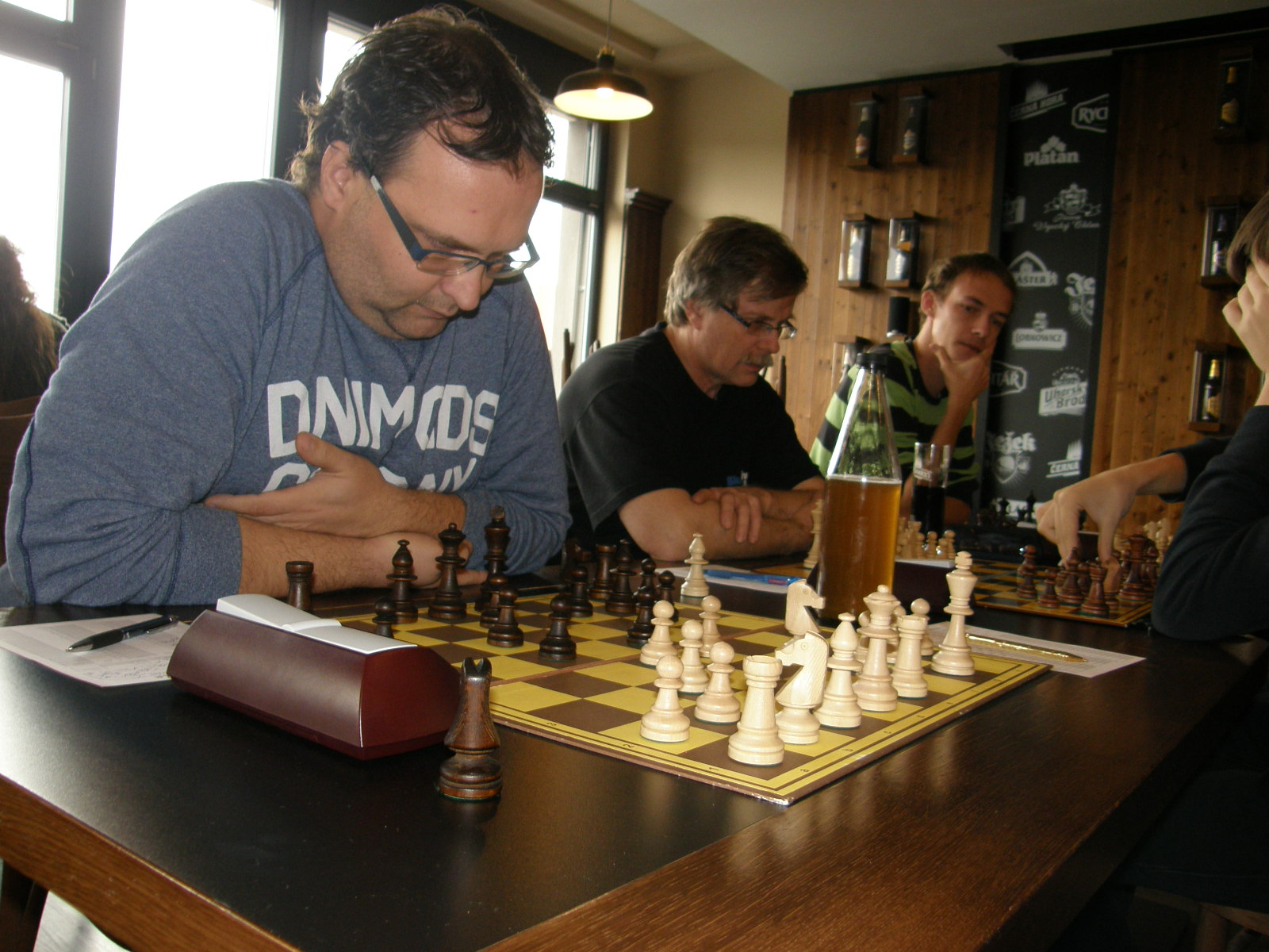 Na sedmé a osmé se také nakonec urodilo nejrychleji, nejprve Jarda Volf přetavil prostorovou převahu v převahu materiální, chvilku po něm dotáhl k bodu Zdenda Šimek pozičně dobře vedenou partii. Dvě remízy jsme poté přidali černými – nejprve Vašek Grundman (půlku Petru Marešovi odmítl, za pár tahů ji sám nabídl), pak já (stál jsem jako čuník a s výrazně horším časem, soupeř mě omilostnil). Poté ještě zapůlili Vlasta s Martinem, ten převedl podezřelou pozici do hratelné koncovky. Dohrávají se tak tři partie, na první máme kvalitu víc, na páté a šesté floka – to by mělo stačit.