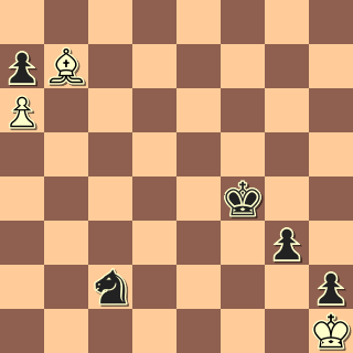 Matěj snad promine, že sem nedávám žádnou z jeho početných výher, většinou šlo o prostá dobrání materiálu. Tahle pozice je pro černého jasně vyhraná, ale ještě musí udělat poslední krok. 1. Sf3! Bílý se chytá stébla. Kdo si vzpomíná na harrachovskou přednášku Pavla Šimáčka o patové záchraně v koncovkách? 1. … Je1! Braní střelce bylo tabu. Naopak jezdec směřuje tam, kam má. 2. Sb7 Ke3!? Proč ne, dokonce je to nejrychlejší – ale ne nejsnadnější. Podobná koncovka se nejlépe řeší obecně – nehledám nejbližší tah, ale rozestavení figur. A tady je to jednoduché: Proměnné pole h1 se napadne jezdcem z pole f2 – tedy 2. … Jd3! a bílý nemá obranu proti 3. … Jf2+ a 4. … h1D+. 3. Se4 Kf2 4. Sg2 Ke2?! Úlohovou cestou k výhře bylo 4. … Jd3! 5. Sb7 g2+!! 6. Sxg2 (6. Kxh2 g1D+) 6. … Kg3! a není obrany proti 7. … Jf2 mat! 5. Sb7 Kd3 Matěj to na královském křídle nevymyslel, jde si proto pro pa6. 6. Se4+ g2+?? To je jednak nemožný tah (soupeř nereklamoval), jednak odevzdání volných pěšců! Bylo možné pokračovat v cestě pro pa6 po nějakém 6. … Kc4 7. Sd5+ Kb5 8. Sc6+ Kb6 9. Sb7 Jd3 10. Sc8 Jc5. 7. Sxg2 Jxg2 8. Kxg2 a bílý to stihne akorát. 8. … Kc4 9. Kxh2 Kb5 10. Kg2 Kxa6 11. Kf2 Kb5 12. Ke2 Kc4 13. Kd1 Kb3 14. Kc1 = (Závěr partie jsem nezapisoval, takže od oka.) 1/2