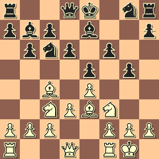 Bílý je přirozeně vyvinut, zato černý vystavěl svéráznou kamennou zeď. To mívají začátečníci v oblibě, ale slabiny na bílých polích jsou strašlivé. 1. Jd2! Správně, dáma jde na krále po bílých diagonálách! 1. … Jh6?? Jedině po 1. … h5 by se ještě dalo hrát. 2. Dh5+ 0-0?? To je nemožný tah (při šachu nelze rochovat), což Tomáš správně reklamoval. Černý se tedy opravil: 2. … Kf8 3. Dxh6+ Kf7?? A je tu druhý reklamovaný nemožný tah a s ním konec partie. Bílý byl ale vyhraný i bez toho. 1:0