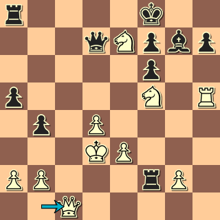26. … Db5+ Zásah, loď potopena. 27. Ke4 (27. Dc4 Vd2+) Ve8 Pořád je to jen kvalita, ale s králem na procházce a s figurama svázanýma to nejde. 28. Dc7 De2! 29. Dc5 Ani ústup věže nepomáhá, např. po 29. Vh4 je nejrazantnější Vxf5 30. Kxf5 Dxe3. 29. … Dxh5 Dvojšach bílému už nic nedá. 0:1
