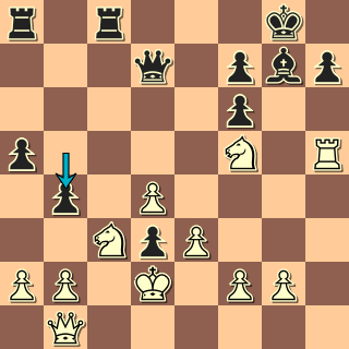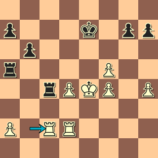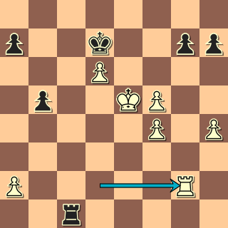 a černý stojí před volbou, co s věží. Je jasné, že 39. … Vxc2?! by zbytečně odevzdalo sloupec, naopak 39. … Vac5! by vynutilo výměnu se ziskem sloupce pro černého. Černý si vybral 39. … Vaa4?! a ukazuje se, že bílý s výměnou nemusí spěchat. 40. Ke5! a šance bílého stojí najednou podstatně výš. 40. … b5 Co jiného? 41. Vxc4 Teď už je výměna potřeba, aby mohl d pěšec postupovat (v minulém tahu by to ještě nešlo: 40. Vxc4? Vxc4 41. Ke5 Vc1 42. d5 Ve1+). 41. … Vxc4 42. d5 Vc1 (42. … a5!?) 43. d6+ Kd7 44. Vg2