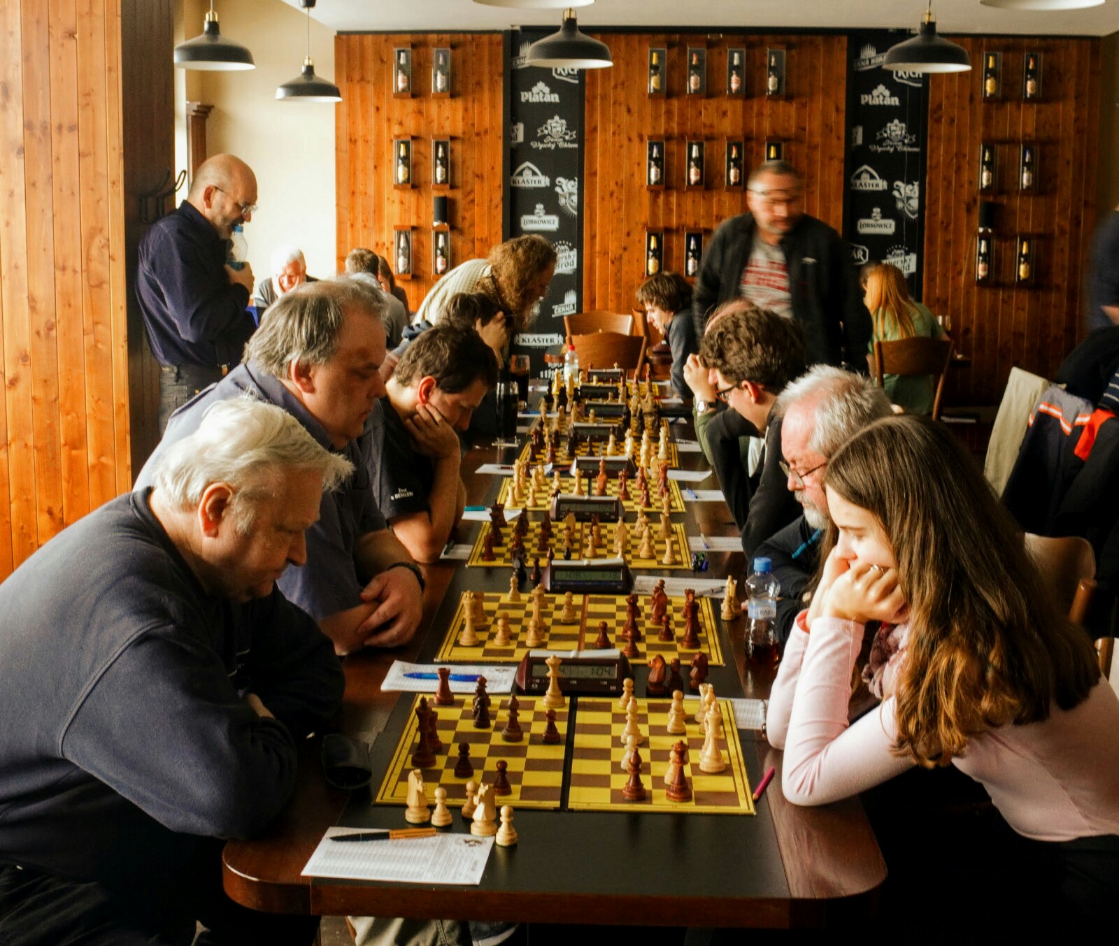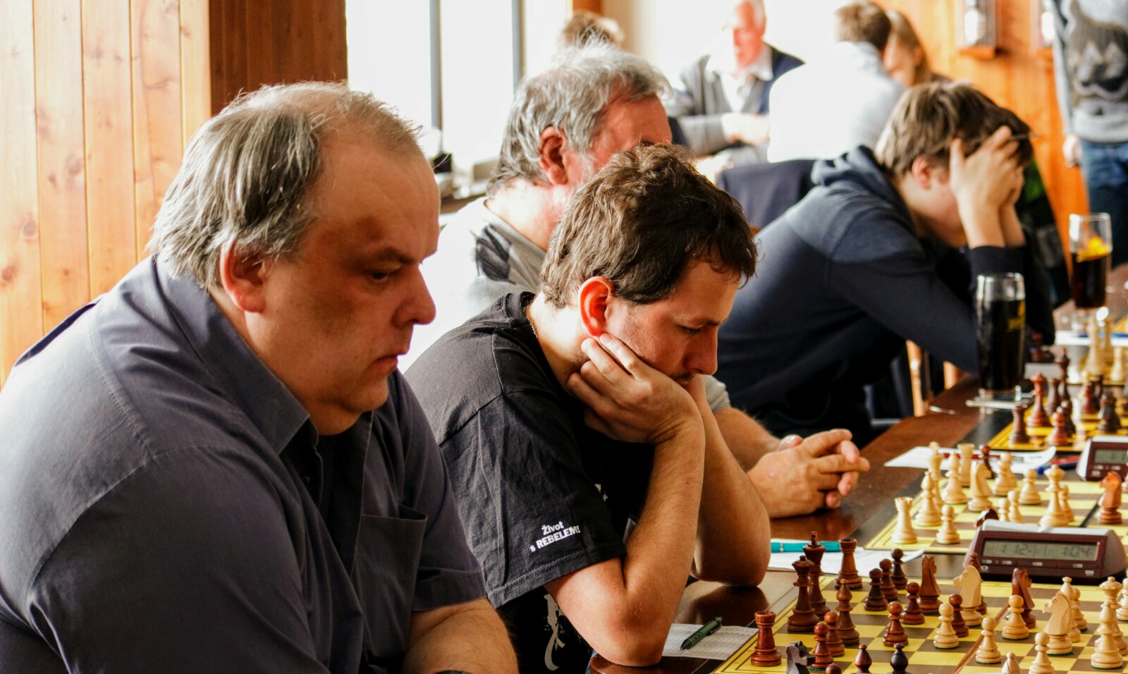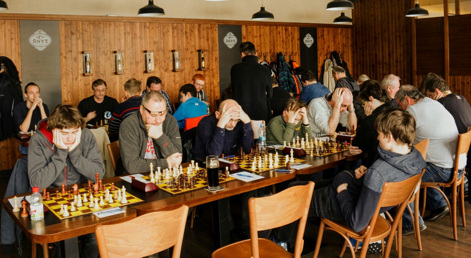 Šnyt se zase jednou zaplnil šachisty. Jak ukazují i fotky, hrálo se soustředěně, poměrně dlouho – a pro nás velmi úspěšně, spolu s éčkem jsme posbírali všechny zápasové body s pěkným skóre 16:5.