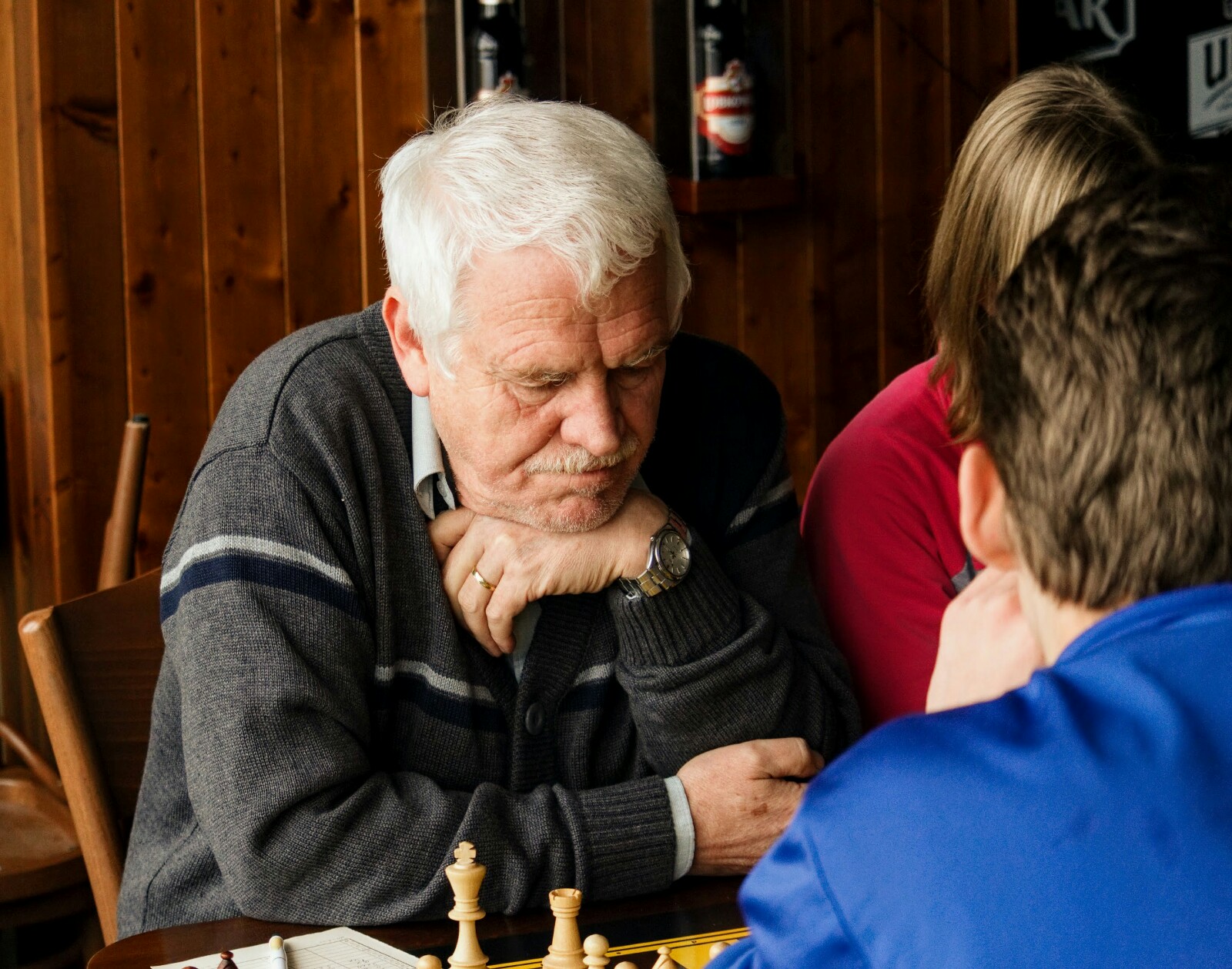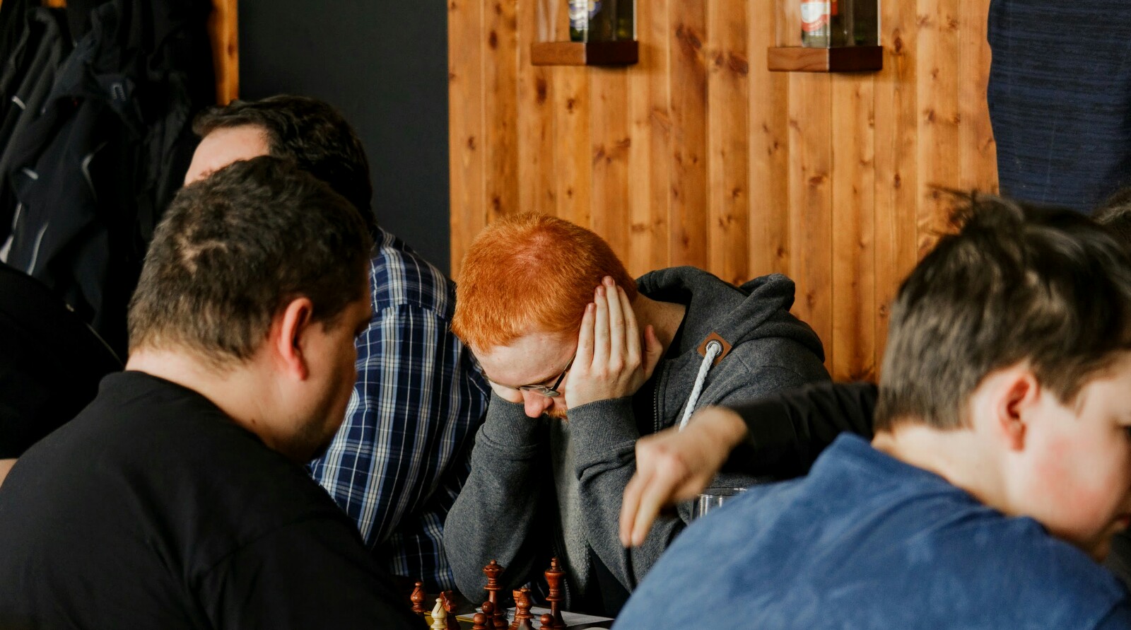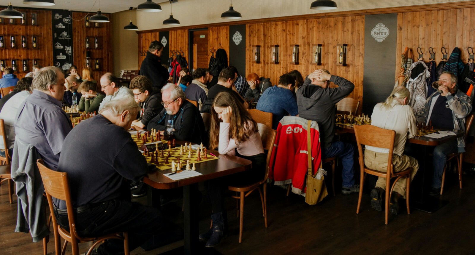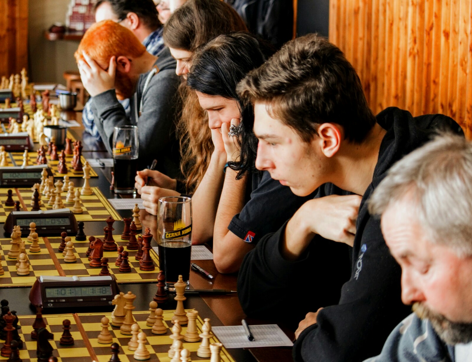 Šnyt se zase jednou zaplnil šachisty. Jak ukazují i fotky, hrálo se soustředěně, poměrně dlouho – a pro nás velmi úspěšně, spolu s éčkem jsme posbírali všechny zápasové body s pěkným skóre 16:5.