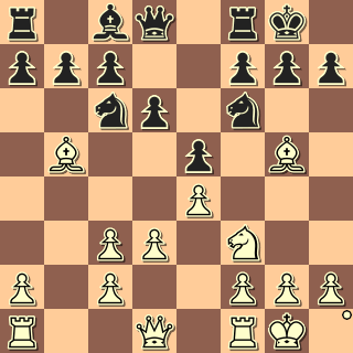 Potud hlavní varianta. Podle chytrých knížek má remízovou pověst, ale s deseti lety jejího hraní si to nemyslím. Rozhodně to není obyčejné potahování figur, pozice je manévrovacího rázu a černý může snadno uklouznout. Dle mého jsou remízové odbočky už dřív a nechám si je pro sebe 🙂 Bg4 Už tohle asi není úplně nejpřesnější, bílé tempo navíc se za chvilku projeví. 9. Re1 h6 10. Bh4 a6 11. Bc4 Na5 12. Bb3 Nxb3 13. cxb3 Černý odstranil dvojku střelců a narovnal bílému pěšce. Re8 14. h3 Bh5 15. Qe2 Qe7 16. Qe3 Qe6 17. Bg3 b6?! První tah, který se mi nezdá, počítač ale problém nemá a hlásí rovinu. Teď začne holáskovské vylepšování figurek. 18. Nh4 Nd7 Snaha předejít f4 a obsadit případně e5. 19. d4!