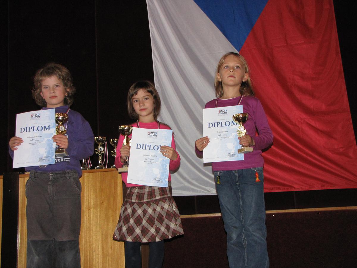Výrazně „nad plán“ se naopak dařilo Verunce. Zahájila sice prohrou na druhém stole, ale následovala úspěšná pasáž 4/5, takže po prvním dnu byla s lepším pomocným hodnocením na čele trojice dívek s největší šancí na medaili. Dnes přidala ještě bodík v posledním kole, takže v součtu 5/9, splněná 4.VT, 14. místo celkově a 2. místo v kategorii D8!!! Myslím, že jde o dosud nejlepší individuální výsledek ústecké mládeže. Povzbuzení do dalších turnajů, Harrachov volá.