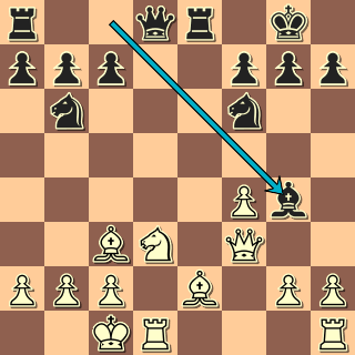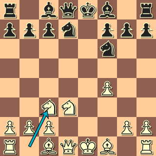 Po šestiminutovém přemýšlení usoudil, že vazba je potřebný taktický motiv, a zahrál 7. … Sb4?? Bílému se ovšem vazba nelíbila, a tak dal 8. Sd2??. Černý prokázal, že principy zahájení ovládá a beze ztráty tempa uklidil krále z volného sloupce 8. … 0-0?? A bílý, zřejmě aby boj o vedení pořádně přiostřil, se rozhodl pro rochádu opačnou: 9. Df3?? Nyní, máme-li věřit oběma aktérům, se jejich oči nad šachovnicí setkaly, oba si uvědomili hrůzu, která se odehrává … a naštěstí byl na tahu černý, takže se nešťastného střelce rychle zbavil 9. … Sxc3! a boj o prvenství v turnaji mohl pokračovat při materiální rovnováze.