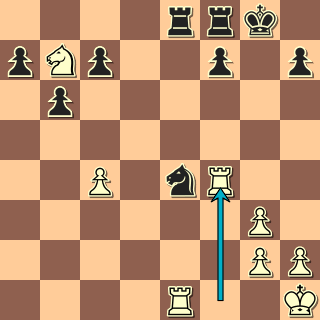 Může černá zachránit jezdce? Ano. 5. … Sxc3! 6. bxc3 Jxa3 7. Vce1 Teď se zase vynořuje motiv Ve1-e3-g3 … a opět ho ani jeden z hráčů nevidí. 7. … Jb5? 8. c4? Jc3? 9. De3? f5 10. Dg3? Partie se definitivně převrací ve prospěch černých figur, koncovka bez chyceného jezdce je jasná. 10. … Dxg3 11. fxg3 fxe4 12. dxe4 Jxe4 13. Vf4?