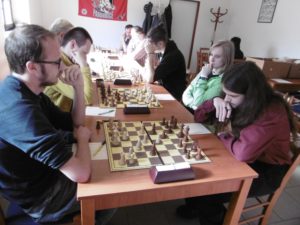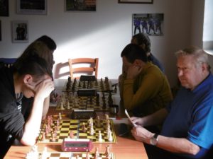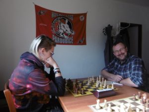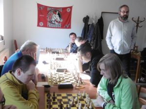 K průběhu asi tolik, že jsme s výjimkou druhé a třetí stáli všude dost hraničně, ale nakonec to na 4,5 nějakým zázrakem stačilo. Základem byl spolehlivý výkon Zdendy Šimka na druhé, který černými postupně přetlačil Verču Šmajzrovou. K výhře měl blízko také Jarda Volf o stůl dál, s Jirkou Píšem postupně utahoval šrouby, asi mohl prorazit matovým útokem… a pak kupodivu neprorazil v koncovce – junior osvědčil pevné nervy v dlouhodobě pasivní pozici. Klíčový bod pak zapsal na páté kapitán Bohouš, jenž s Karlem Taslarem nejprve přehlédl v lepší pozici šikovný soupeřův šejd… pročež si v horší pozici (dvě věže na dámu a lehkou figuru) musel počkat na jednotahový revanš.