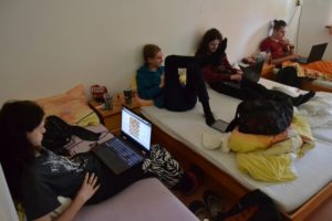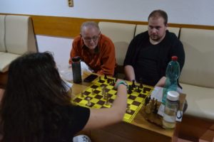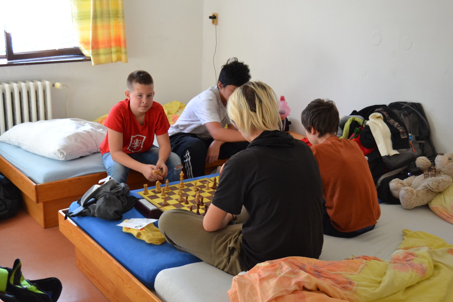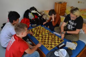 Hrajeme teda šachy, chodíme poctivě na rozbory (Pavel Němec, FM Havlík, ti nám sedí přímo před pokojem), pokoj „menších“ (holky, Adam, Matěj, Tom M.) hraje šachy i na postelích, větší spíš řeší diagramy na lichessu (Vítek už tam vyjel na 2100).