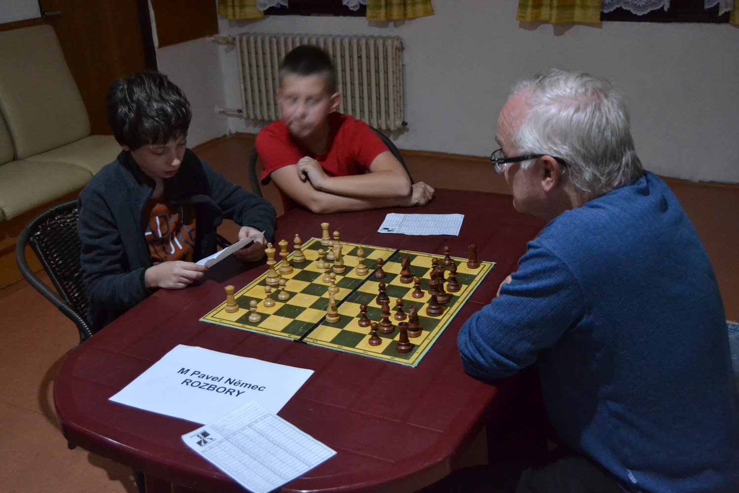 Vojta hraje s Jirkou, měl S+J+p x V+2p, o hodinu lepší čas. Myslel jsem, že to za chvíli zapůlí, ale dosud hrajou, to bude maratón.